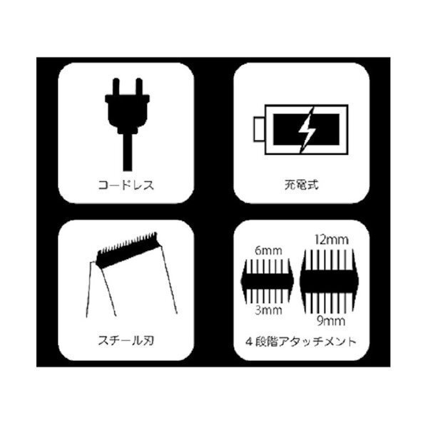 | スチール刃採用 4段階アタッチメント 充電式ヘアクリッパー |