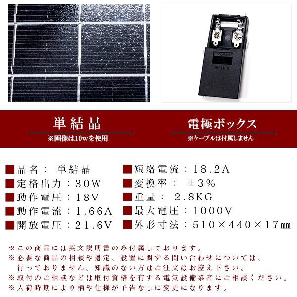 『12V 30W』単結晶 ソーラーパネル アルミフレーム キャンピングカー トラック 船 太陽光 充電 蓄電 チャージ 510×440×17mm