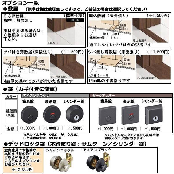 ○ トステム (LIXIL) の室内建具 片開きドア ラシッサD ヴィンティア ○ デザインLGM ○ ノンケーシング 【室内建具 片開きドア 必須選択項目】 ・ 本体色 ・ 枠色 ※標準はプレシャスホワイトです。その他は追加料金が掛かります ・ サイズ ・ 吊元 ・ ハンドル種類 ※種類によって追加料金が掛かります ・ 枠幅(奥行) ・ 沓摺り(下枠・敷居)※標準は無しの仕様です。 ・ ガラス(※ガラス選択可能デザインのみ) その他オプション (追加料金は画像をご確認ください) ・ 錠付き ・ みえナイゾウストッパー ・ 外付け用マグネットストッパー ・ ソフトモーション ---------------------------------- ※サイズが6種類ございます。ご希望のサイズをお知らせください。 (高さは、H2023のみとなります) W648 W734 W754 W780 W824 W868 ---------------------------------- * 同時に複数セット、お買上げ頂けますと、送料の値引を致します。 違うサイズ(違う種類)との組合せでもOKです、是非お問合せ下さい。 |