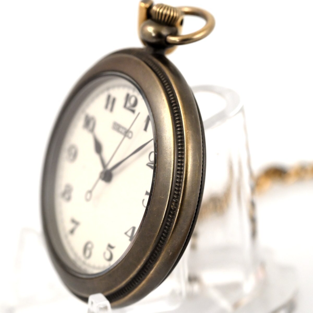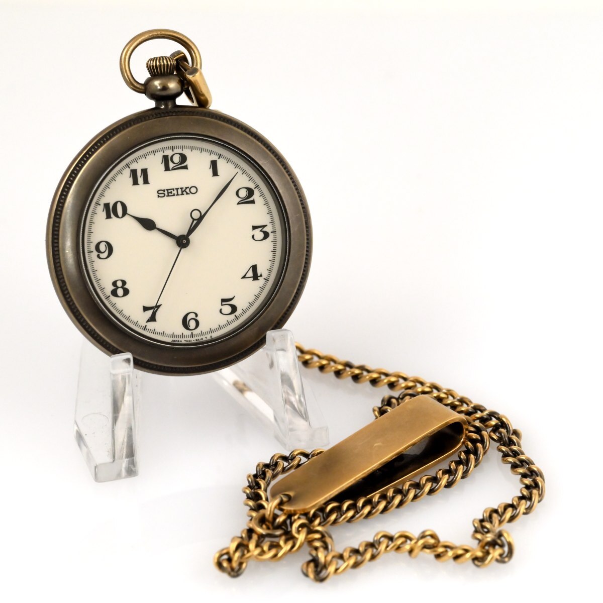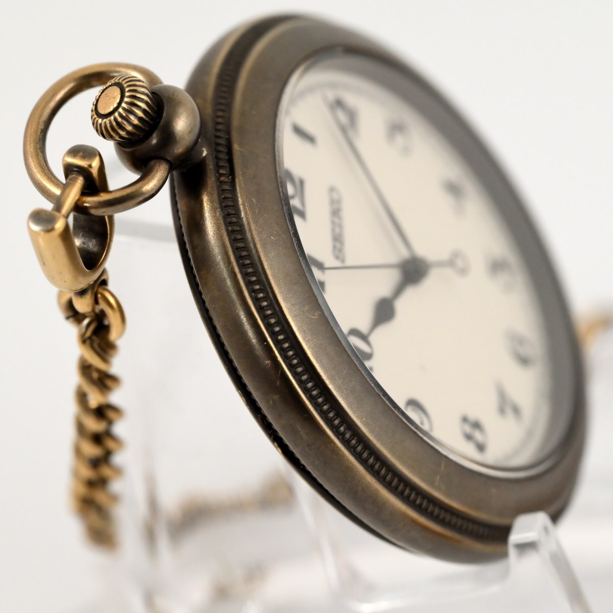 アンティークなブロンズトーンのケースとクラシックなアラビア数字が20世紀初頭の懐中時計を彷彿とさせながらも、セイコーならではの確かな精度を維持しています。オリジナルのマッチングチェーンとクリップが付属します。