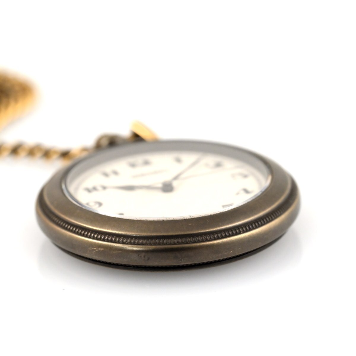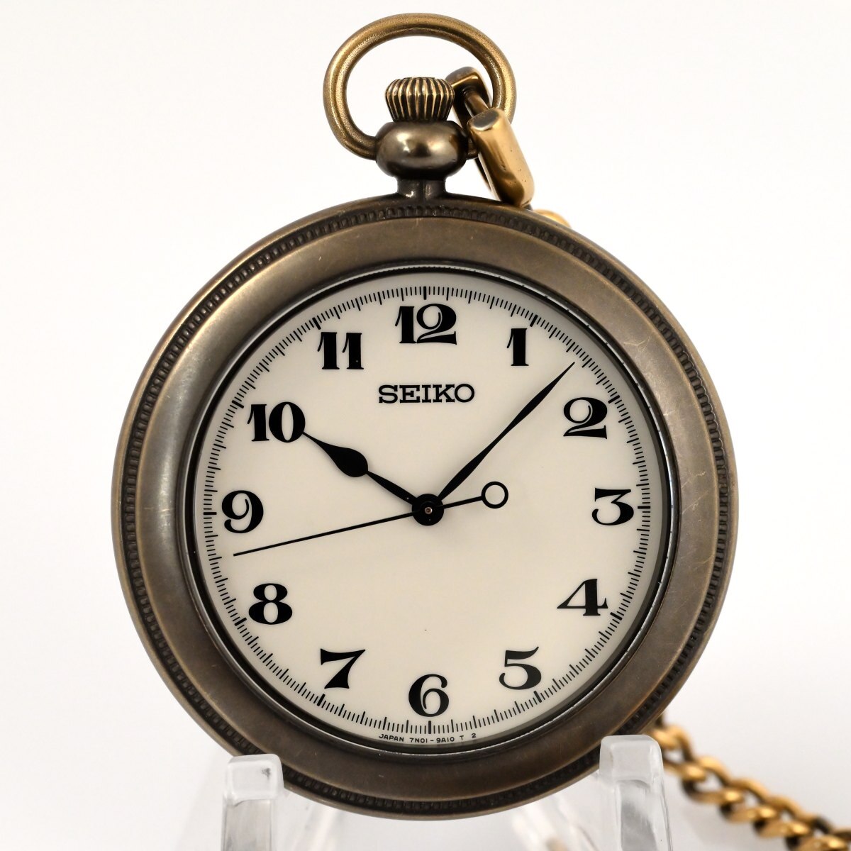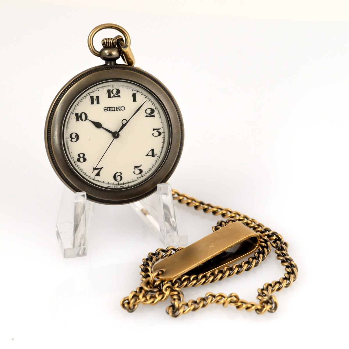 アンティークなブロンズトーンのケースとクラシックなアラビア数字が20世紀初頭の懐中時計を彷彿とさせながらも、セイコーならではの確かな精度を維持しています。オリジナルのマッチングチェーンとクリップが付属します。