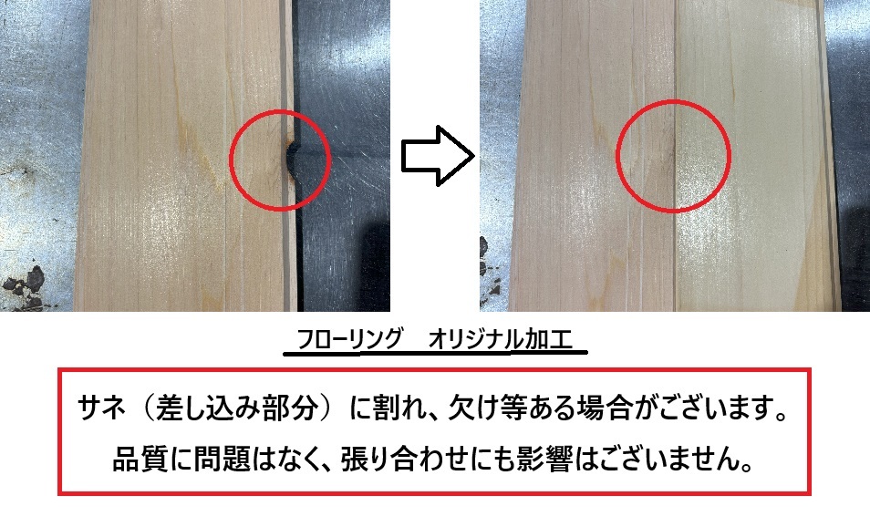 ・寸法誤差あり。端は直角でなく、端部に割れ・抜け節・へこみ等あります。