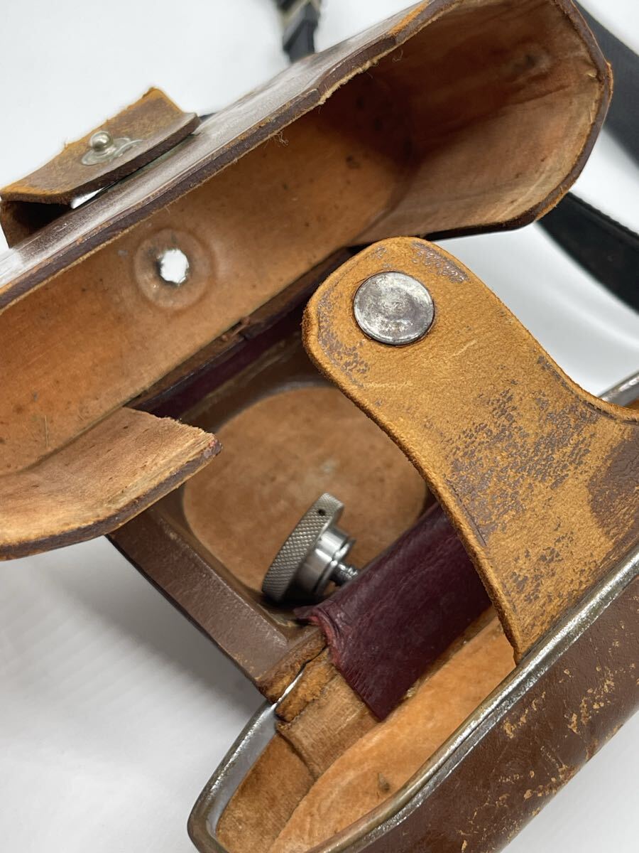 The viewfinder has haze, and the leather case shows wear and peeling.