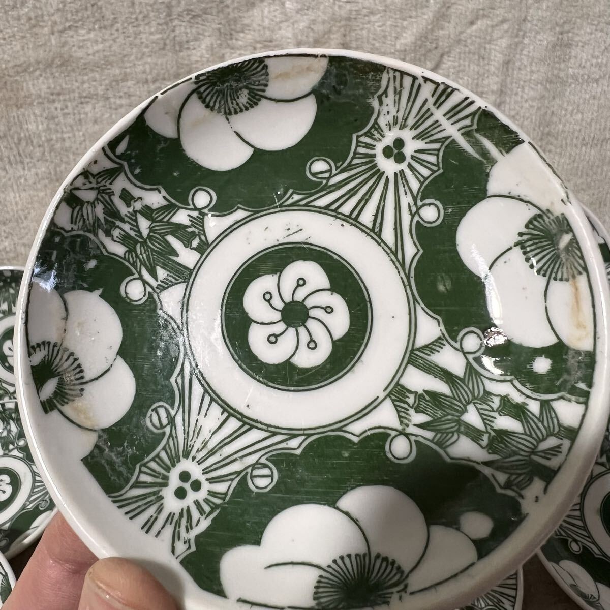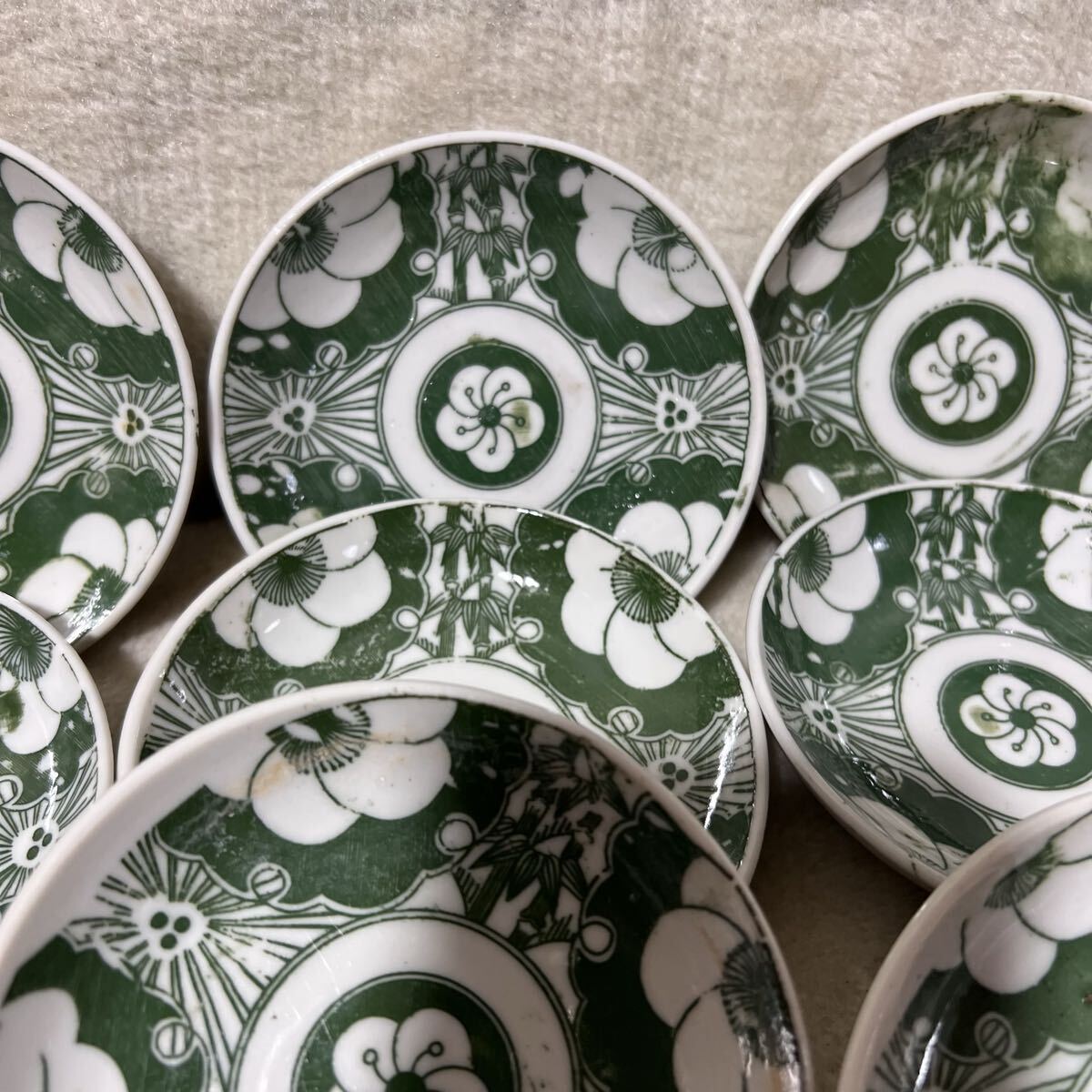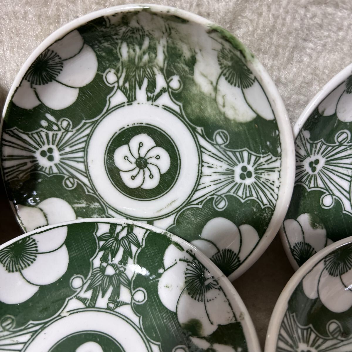 商品名:C3218 骨董 小皿 手塩皿 ねじり梅 ねじり桜 竹 緑色 印判 時代物 焼き物 和食器 アンティーク コレクション ユーズド