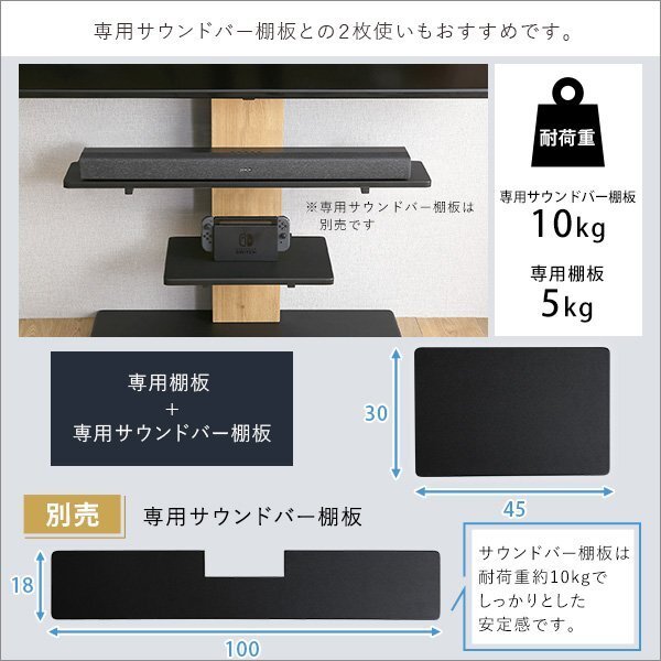 | 100インチ対応 頑丈・デザインテレビスタンド専用棚板です。 専用棚板にはレコーダーやゲーム機器を置けます。 オシャレに小物置きにすればインテリアとしても楽しめます。 3段階高さ調整ができるので、テレビの大きさに合わせて設置できます。 棚板を2つ使う更に便利に活用できます。 耐荷重は約5kgで安定してしっかり支えます。 |