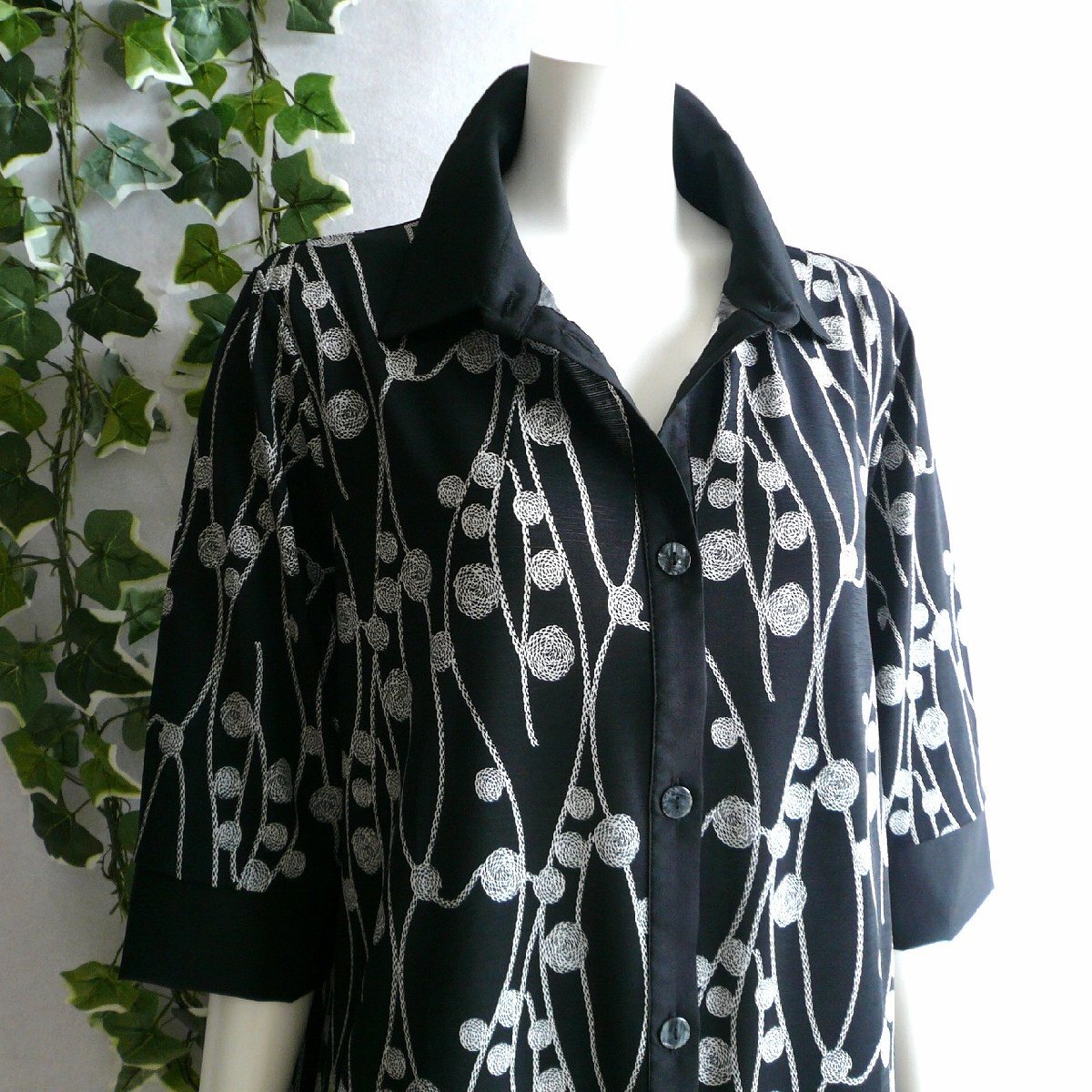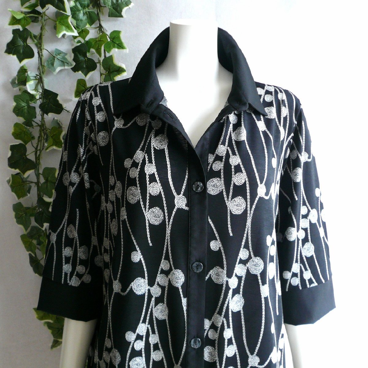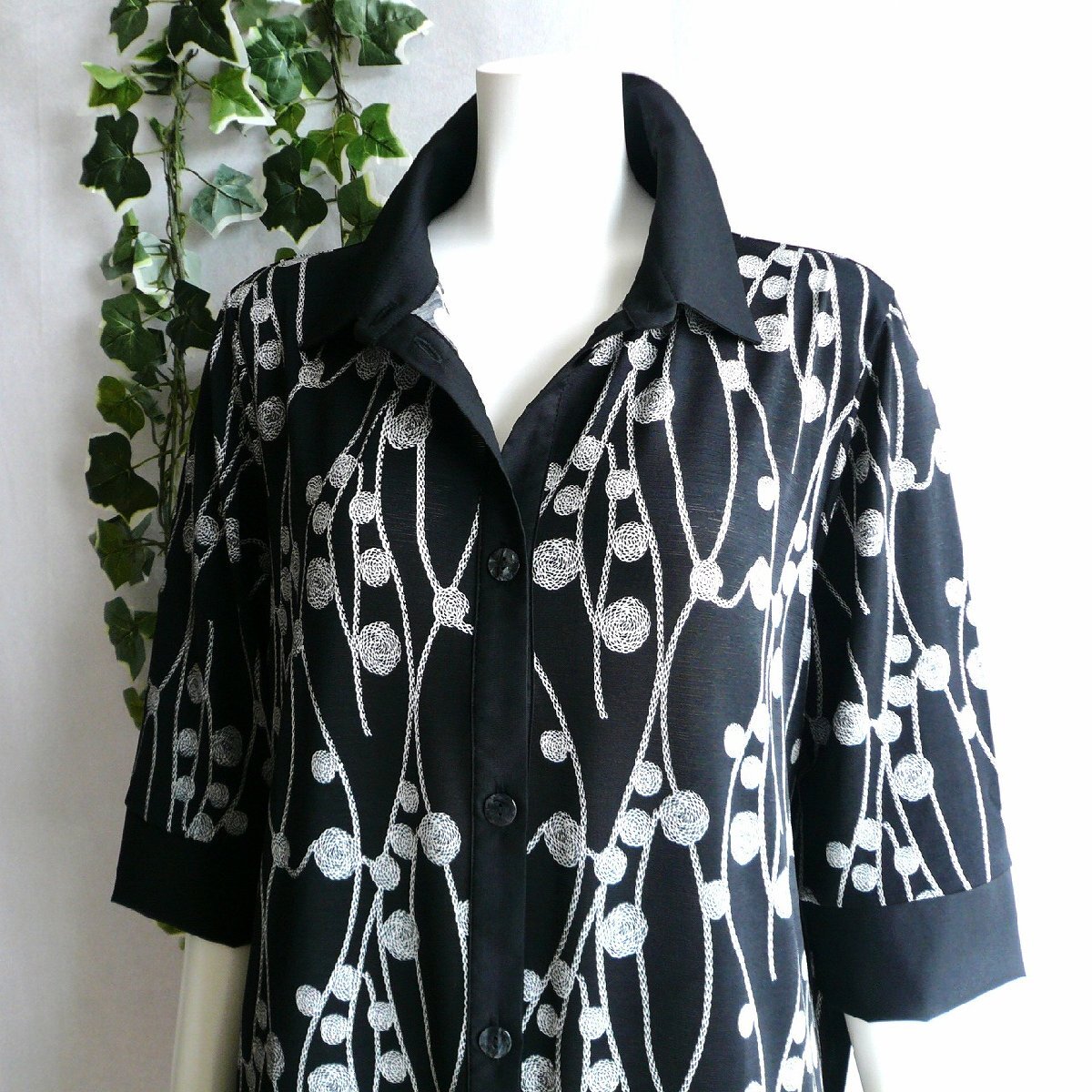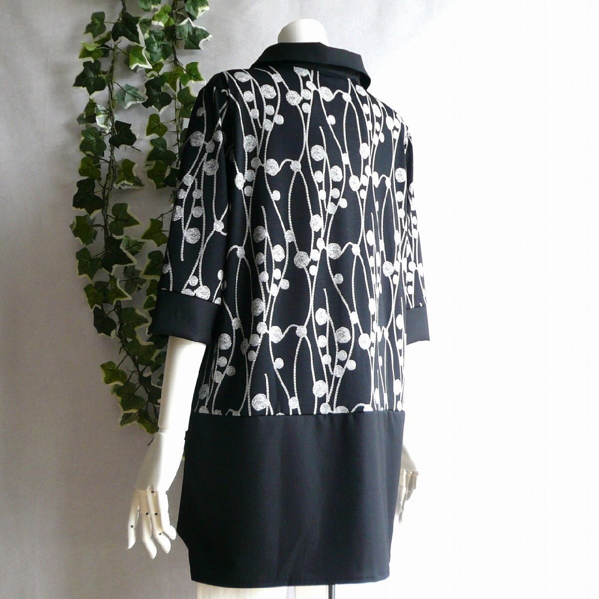 新品 9958 LL 刺繍風 チュニック ブラウス 黒系 秋 レディース 配色切替 襟付き前開き ゆったりサイズ 上質 上品 50代 60代 70代