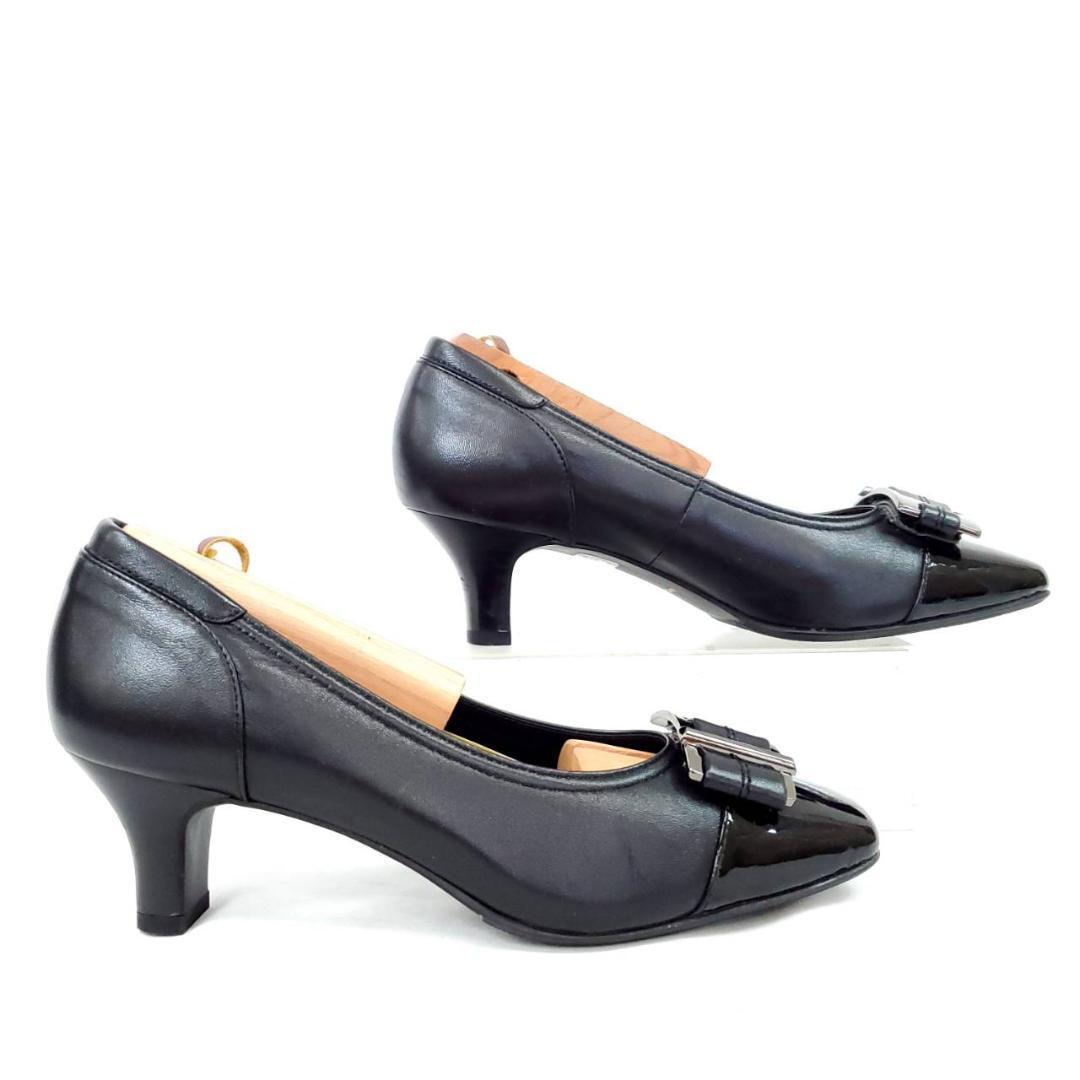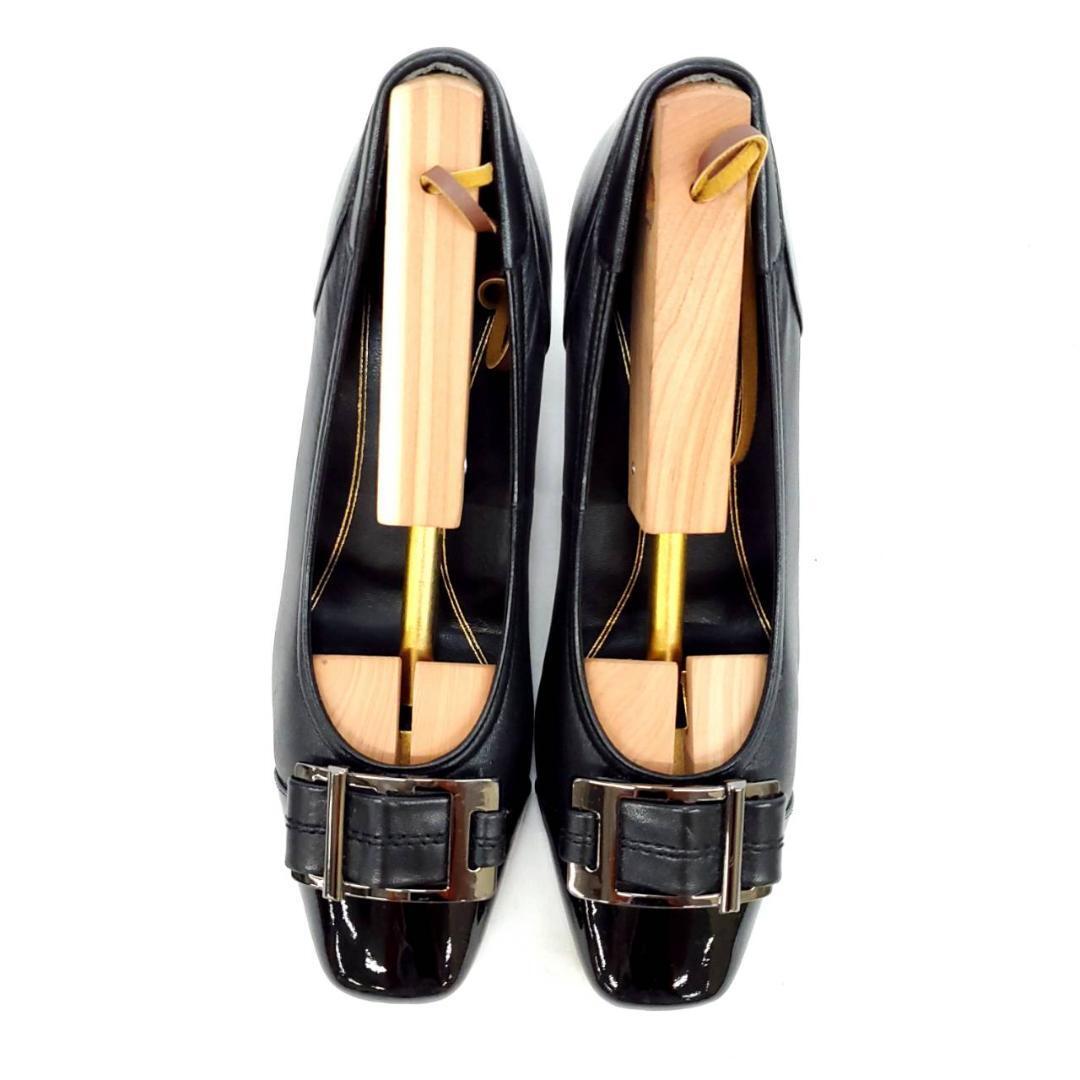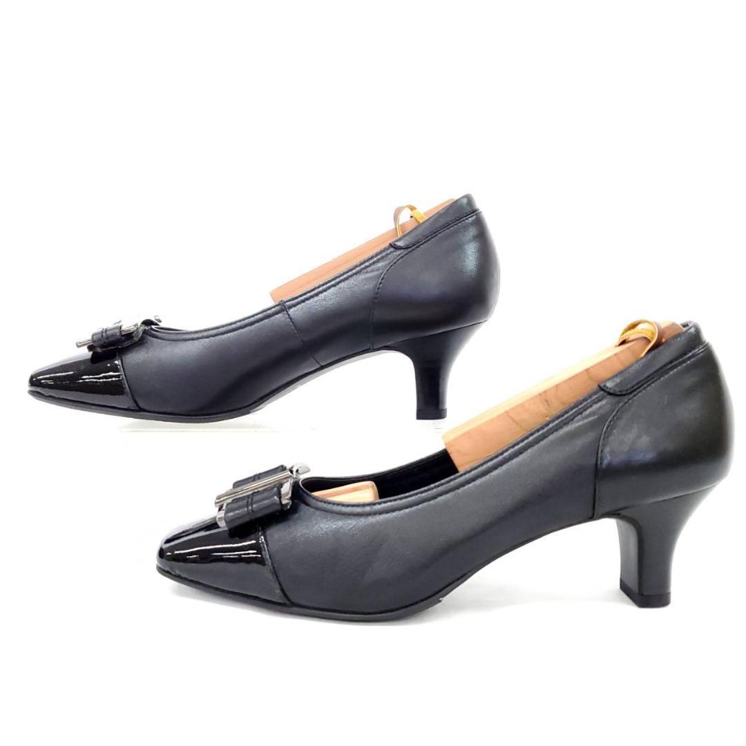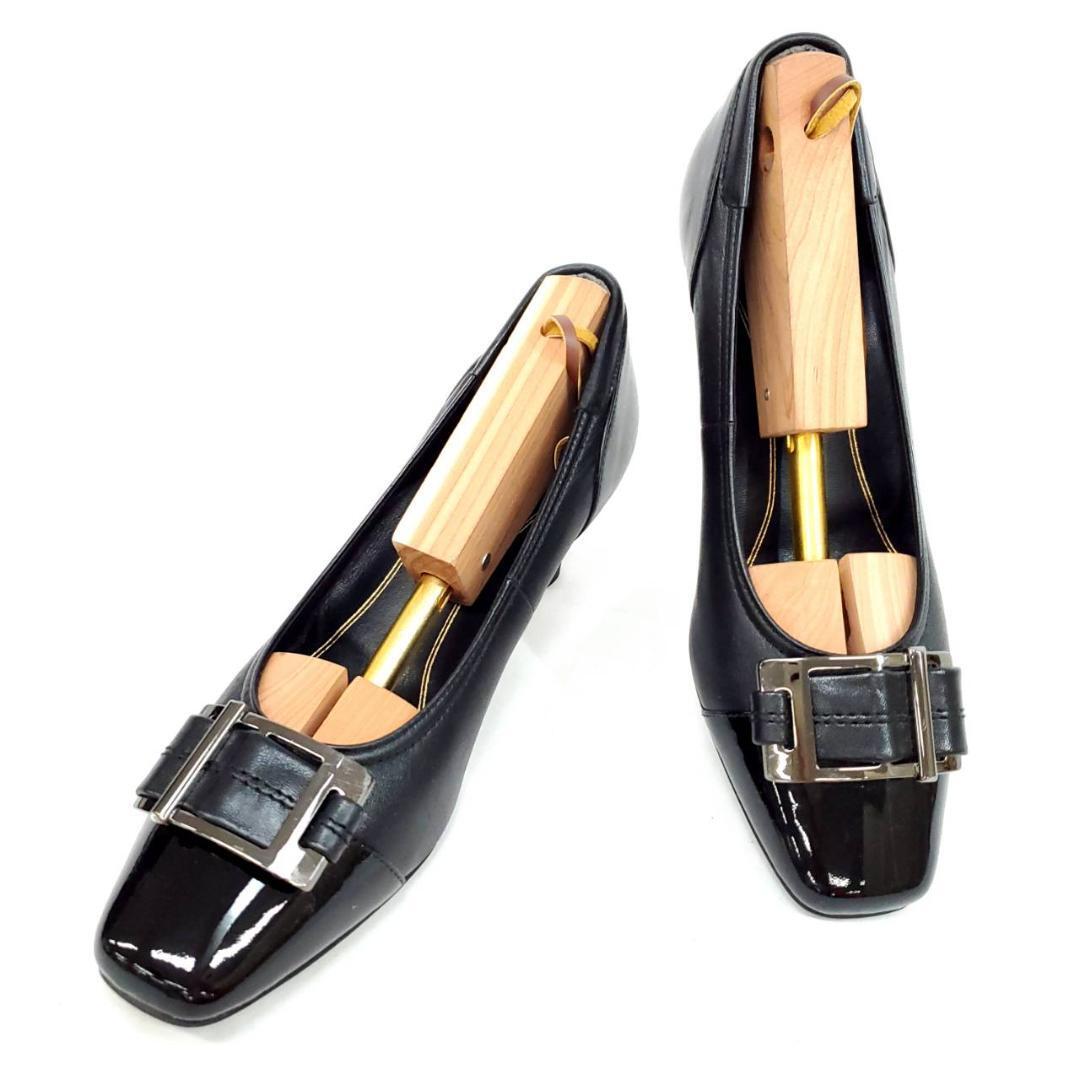 つま先のエナメル素材と大ぶりのバックルがアクセントになった、洗練されたデザイン。