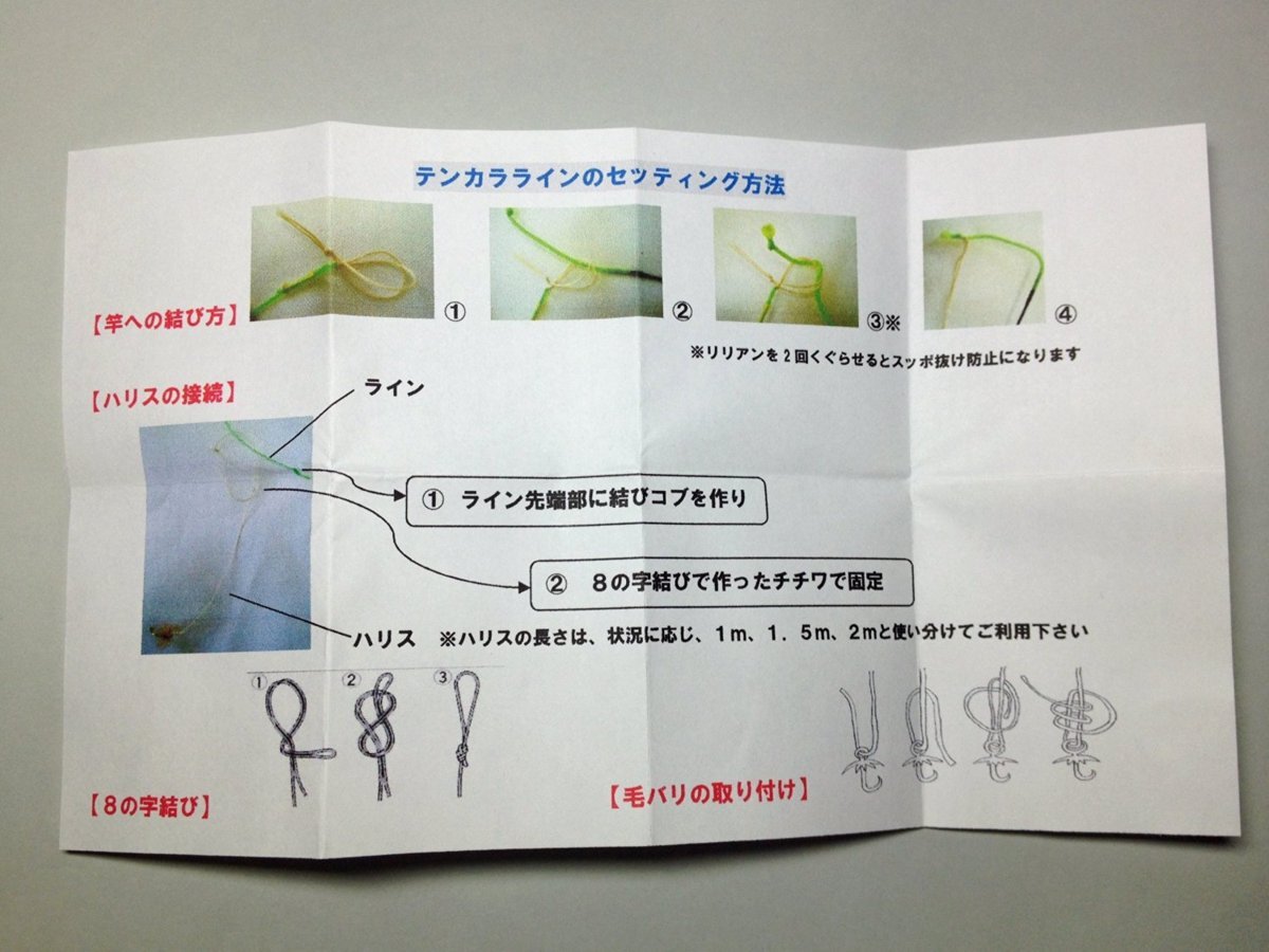 パッケージ内に、竿への取り付け、ハリスの結び方、毛鉤の取り付け方法の解説が入っているので、