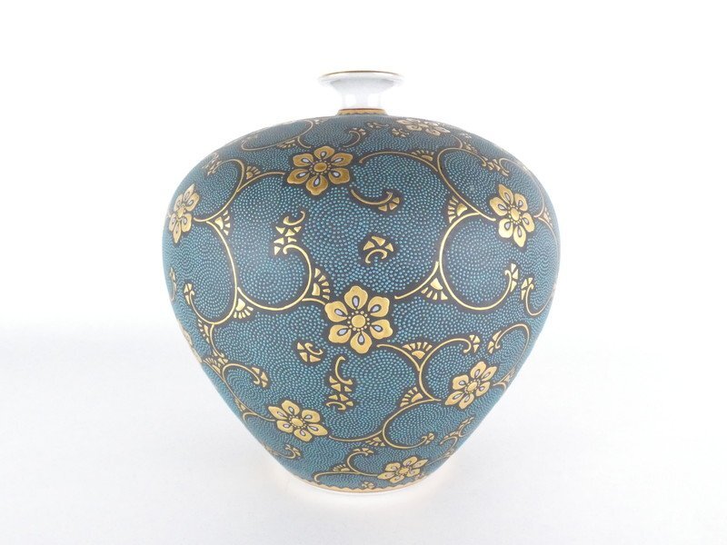 【都屋】仲田錦玉「渦打青粒 花瓶」共箱 約18cm 九谷焼
