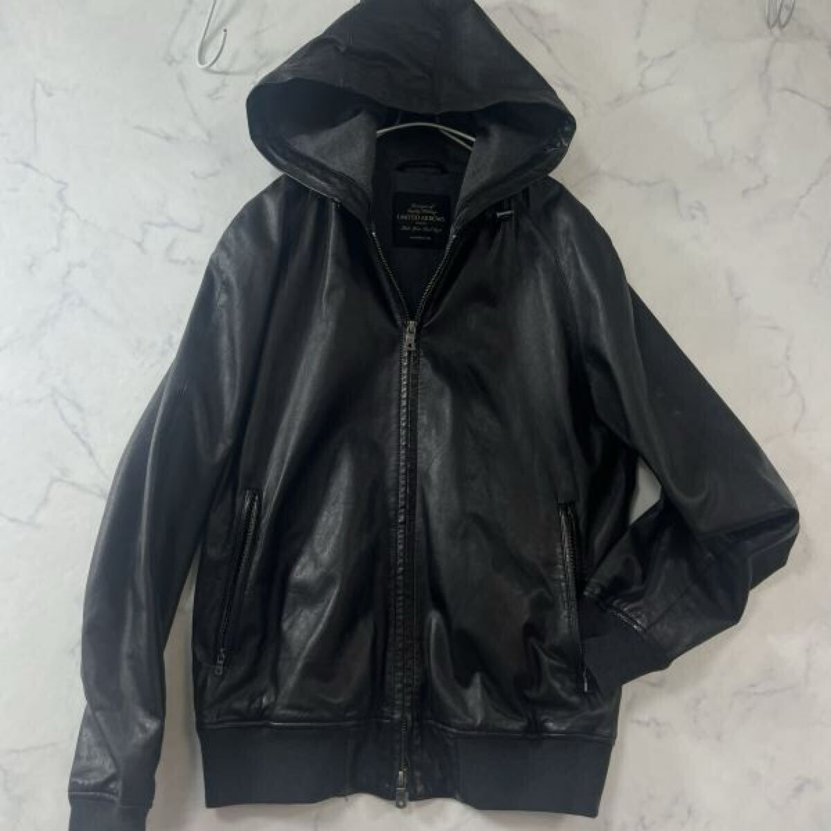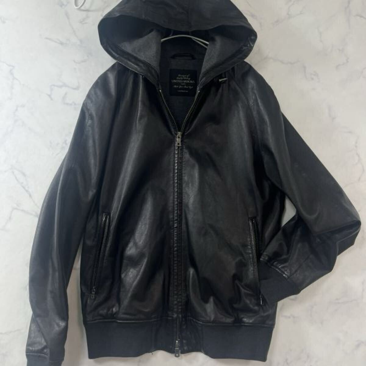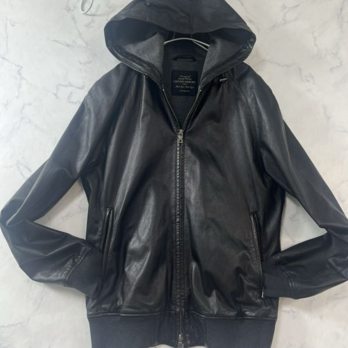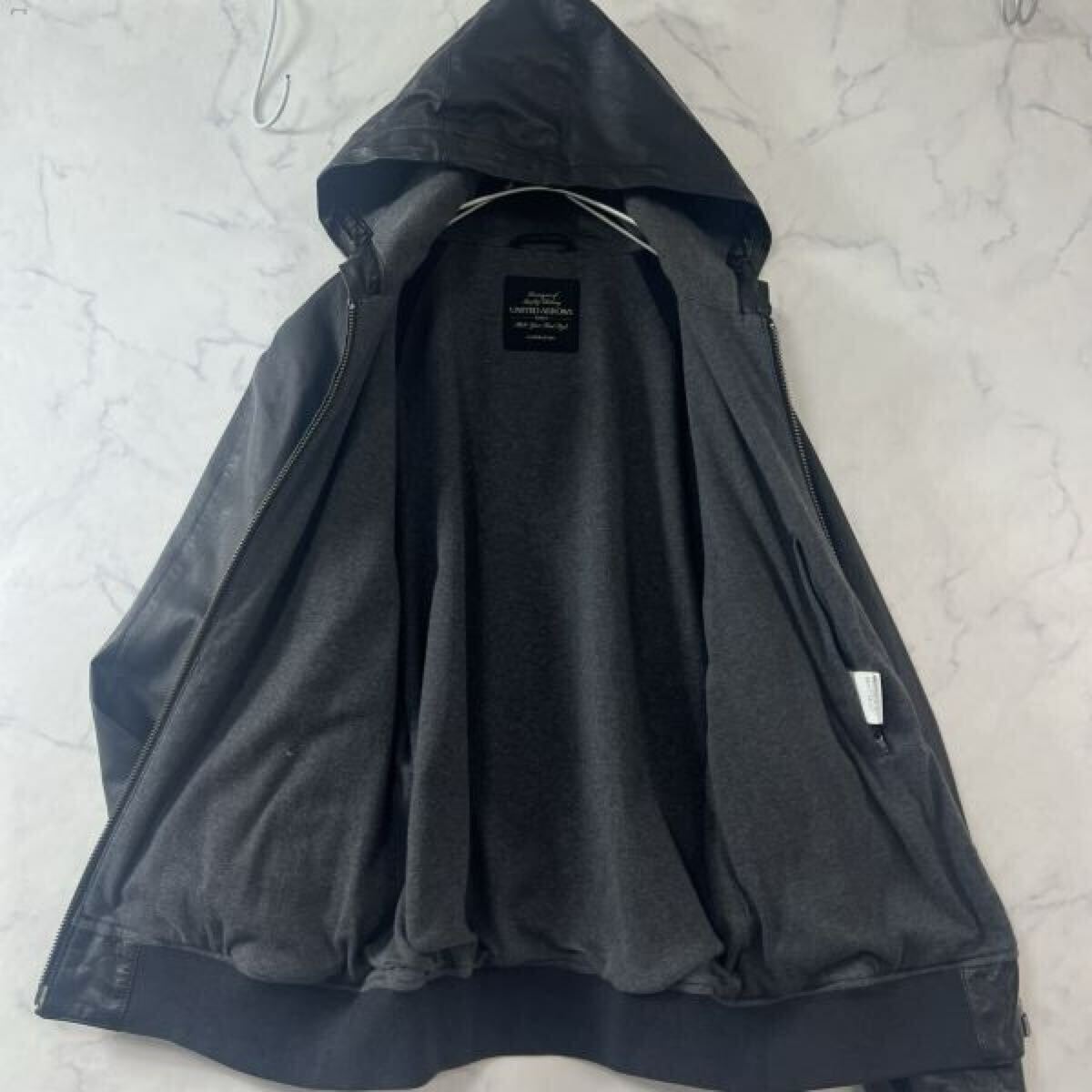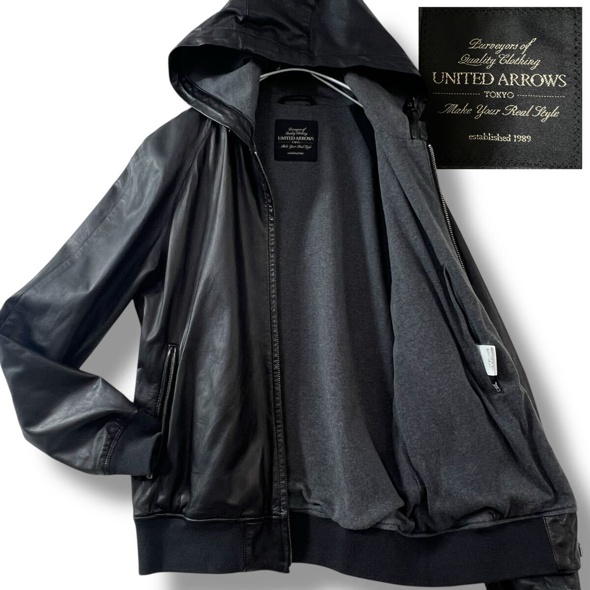 美品 ユナイテッドアローズ 黒タグ 本革 レザージャケット パーカー フード コート 羊革 ラムレザー