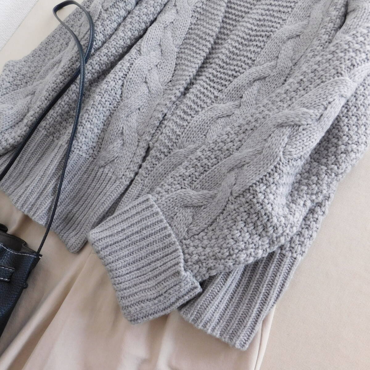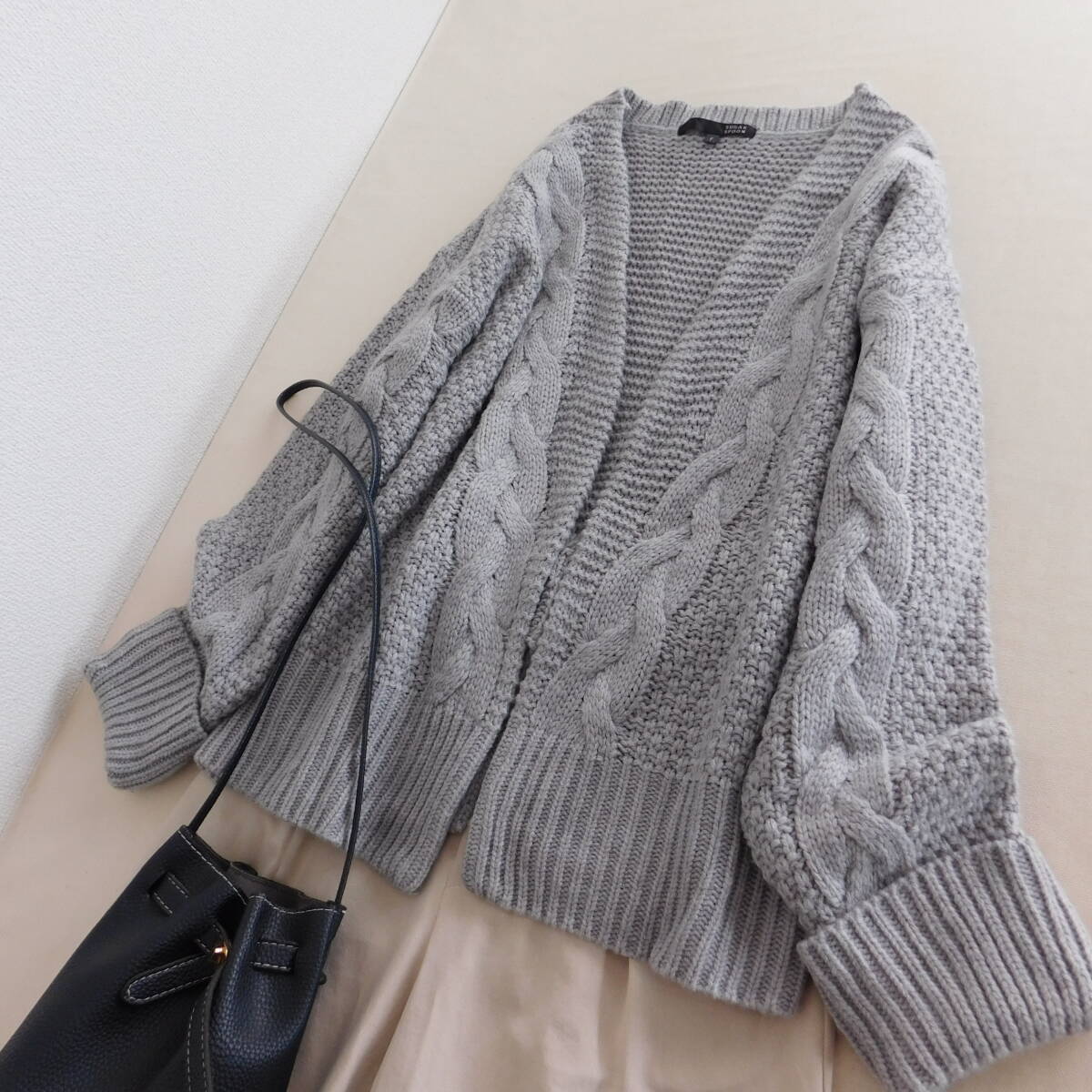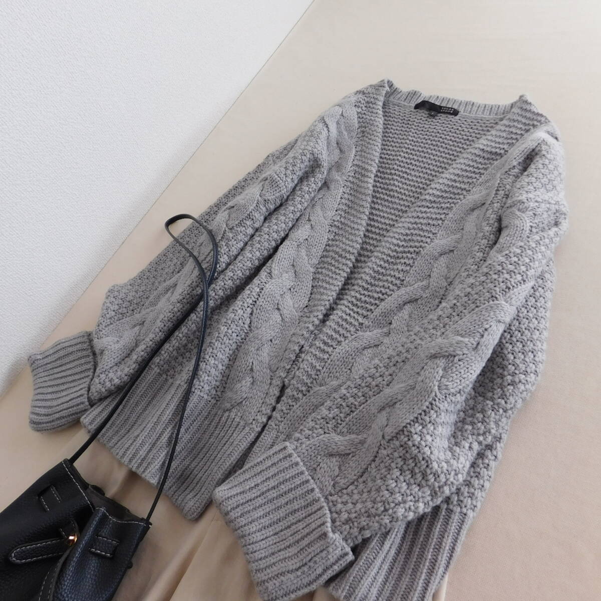 グレーカラーのケーブルニットで羽織のカーディガンがかわいいです。