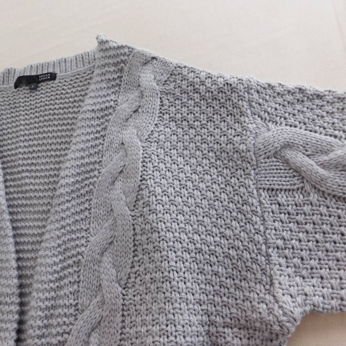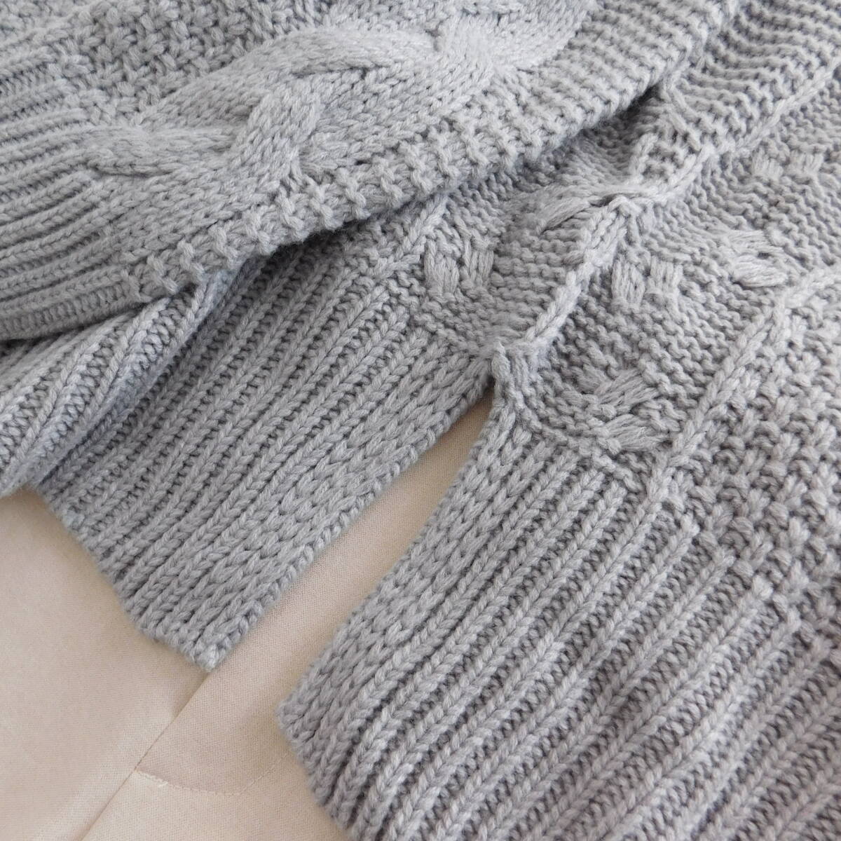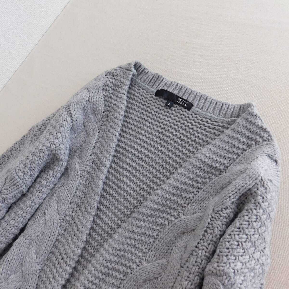 グレーカラーのケーブルニットで羽織のカーディガンがかわいいです。