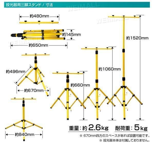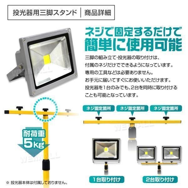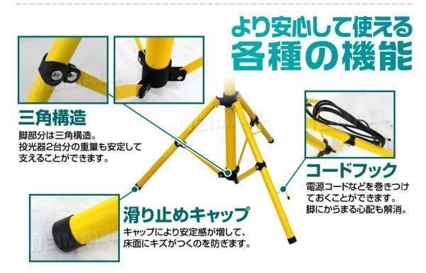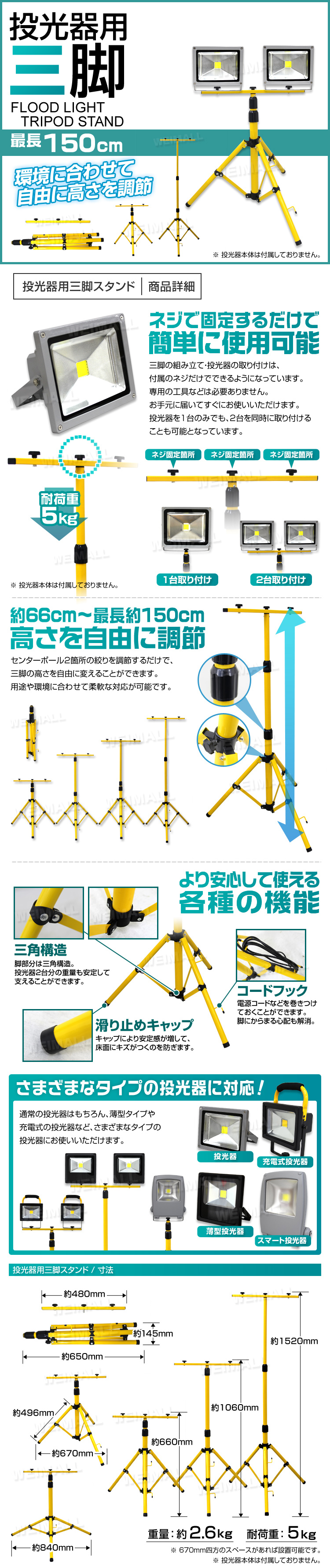 | 投光器(作業灯)を取り付けて使える専用のスタンドです。 専門的な工具は必要ありません! 投光器の取っ手部分をネジで固定するだけで簡単! すぐ使えます! 最大150cmまで伸縮OK! 投光器2台を取り付けた場合、それぞれ独立可動して照射方向を変更でき、広範囲を照らすことが出来ます。 脚部分には三角構造を採用! 重量感のある投光器2台分の重さもがっちりと支えてくれるから安心です! また電源コードを巻きつける便利なコードフックが付いています。 【商品仕様】 ・サイズ(約):66cm~152cmまで調整可能 ・重量(約):2.6kg ・耐荷重(約):5kg ・投光器対応台数:2台まで対応可能 【商品内容】 ・投光器用スタンド ×1 【注意事項】 ・画像にございます投光器は別売りとなります。 ・当商品を使用した際に発生したトラブル、事故につきまして、当社は一切の責任を負いかねます。 ・当商品は入荷の時期によりカラー、仕様などが変更される場合があります。ご了承下さい。 |