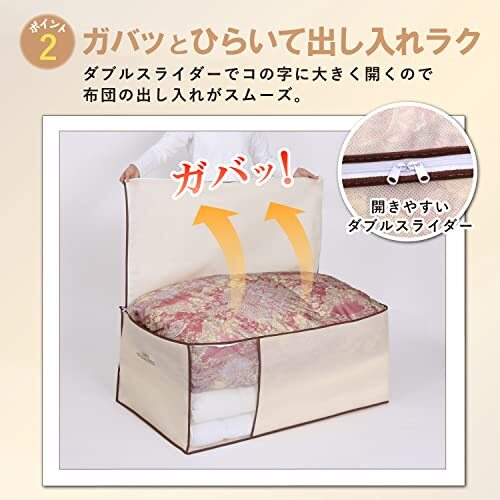 【収納場所へ移動しやすい持ち手付】:収納前後の持ち運びの移動がしやすい持ち手付き。開口部のファスナーもコの字に大きく開くので、大きな布団もらくらく出し入れ。