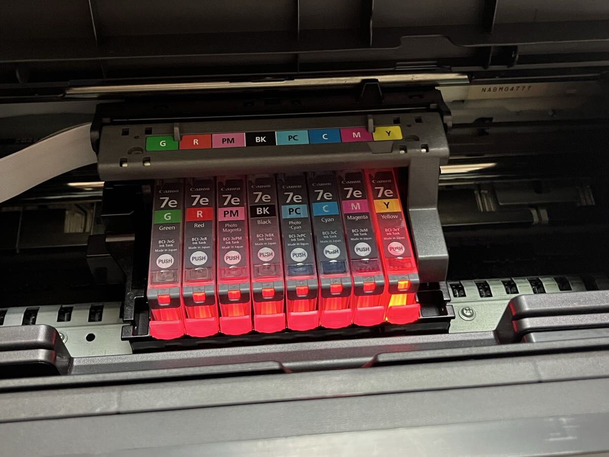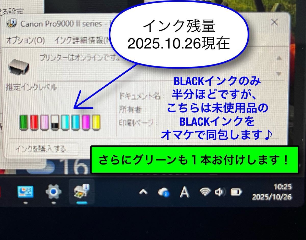 ●インク残量はブラックのみ半分くらいで、残りの7色はフルにあります。そのためブラックについては、未使用品のインクを1本お付けします。グリーンのインクもオマケで付けます。(画像8枚目を参照)