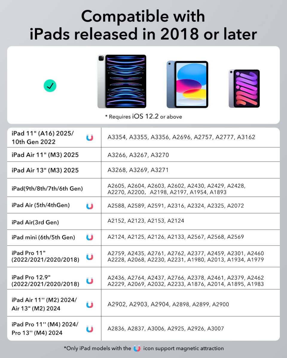 【対応機種】 iOS 12.2以上を搭載した2018年以降に発売されたiPadに対応、NEW 2025 iPad 11th(A16)&iPad Air 11インチ&13インチ(M3)、iPad Pro 11インチ&13インチ(M4)、iPad 10/9/8/7/6世代、iPad Air 11/13(M2)、iPad Air 3/4/5世代、iPad Pro 11インチ 1/2/3/4世代、iPad Pro 12.9インチ 3/4/5/6世代、iPad Mini 5/6世代; 他のiPadモデル、iPhone、Android、Microsoft、またはその他のデバイスとは互換性がありません。