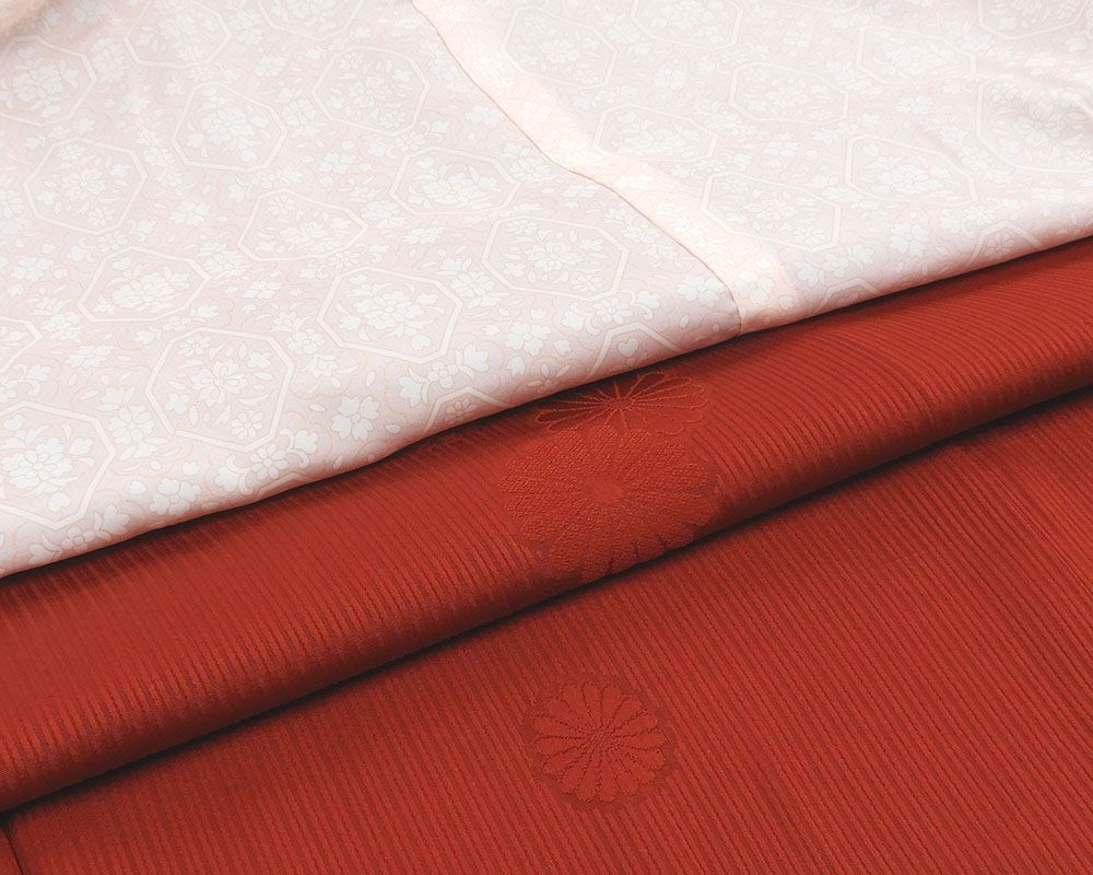 渋め紅色地に縫取りで縦縞菊花地紋が柄付けされています。