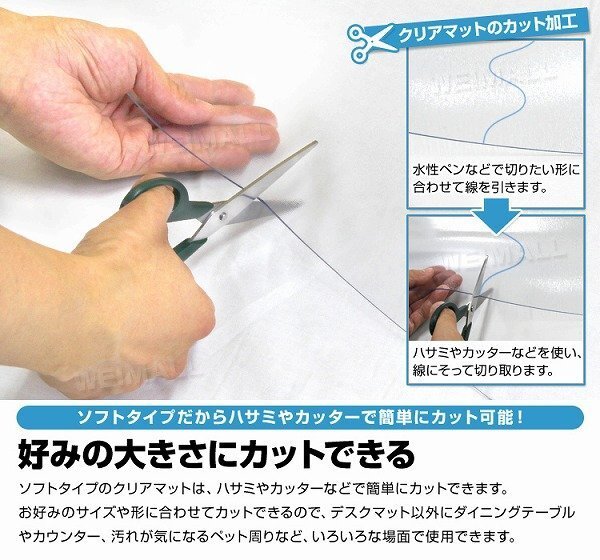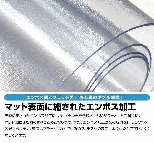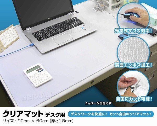 | カレンダーや予定表、メモなど挟めるクリアタイプのデスクマットです。 光学式マウスにも対応しているので、マウスパッドを使用せずにマウス操作ができます。 デスクマット表面にエンボス処理を施すことで、ベタつきを感じさせないサラっとした表面になっています。 また、このエンボス処理は光の反射を抑えてくれる効果も◎! ハサミで簡単にカットができるので、デスクマット以外にも、様々なシーンで使用できます! 【商品仕様】 カラー:クリア サイズ(約):幅60cm×奥行43cm(厚さ1.5mm) 材質:軟質PVC 使用温度(約):−20℃〜50℃ ※お手入れは薄めた中性洗剤を湿らした布につけ、固く絞って拭いた後、水分が残らないように乾いた布で乾拭きしてください。 ※日の当たる所で使用しないでください。日焼けで硬化する場合があります。 |