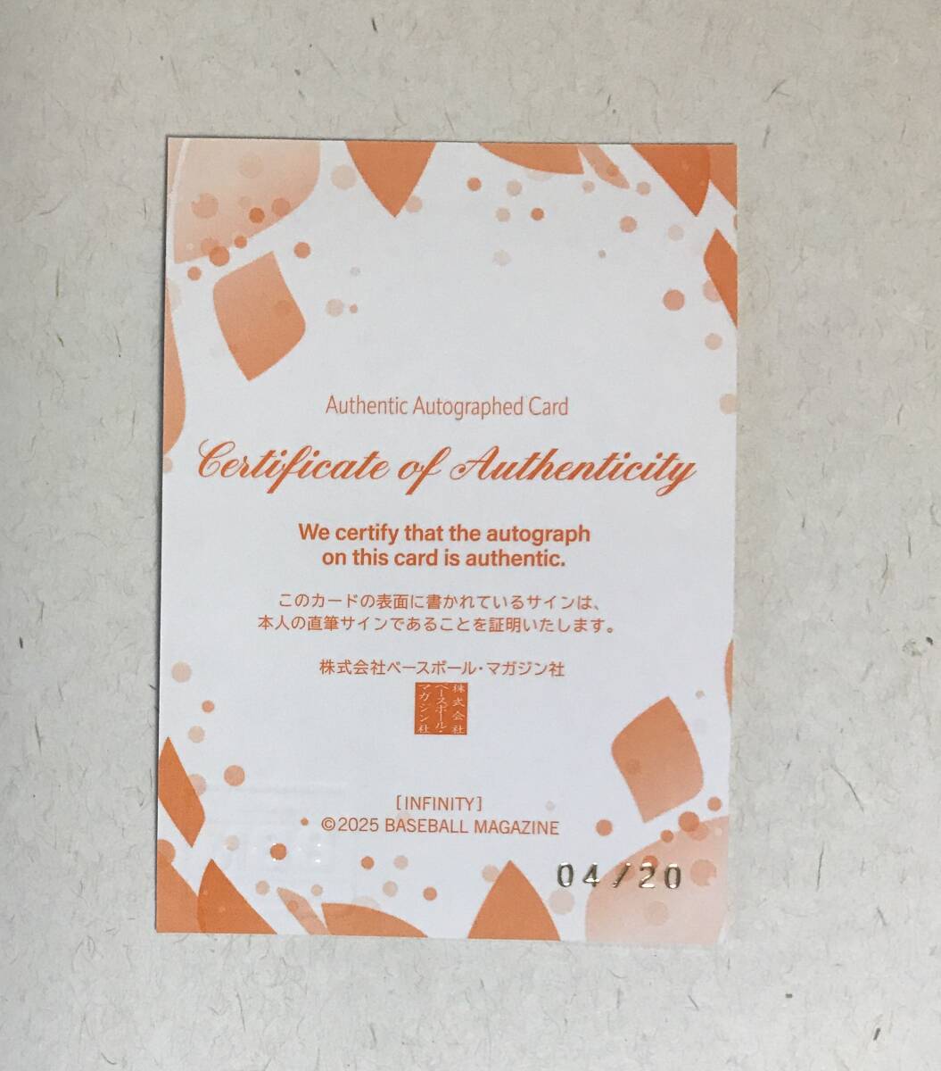 20枚限定 直筆サインカード 縦版 坂本結愛 ソフトボール BBM  INFINITY 2025 インフィニティ