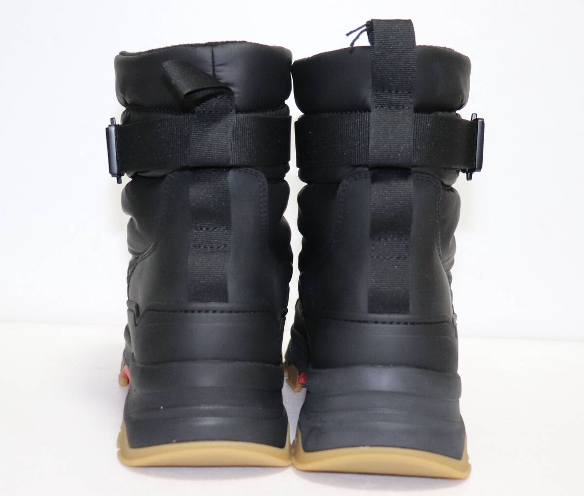 足首をカバーできるハイカット丈のアッパーは、あらゆる天候から足を保護し泥除けとしての機能も備えています。マットブラックのワンタッチバックル、マジックテープの留め具、着脱をより簡単にする幅の広いマチが特徴です。