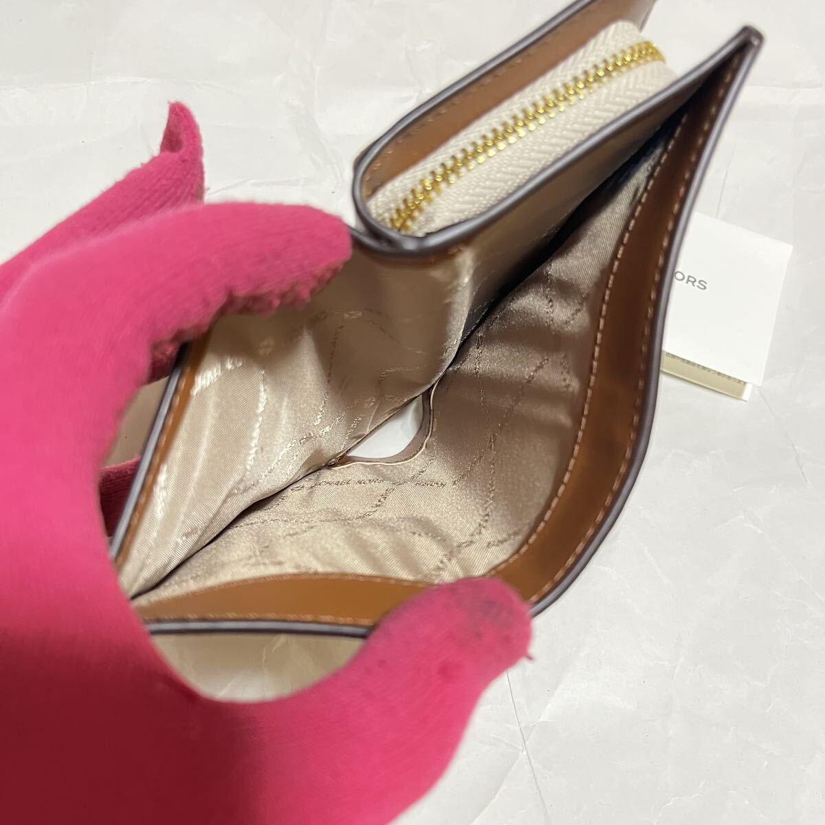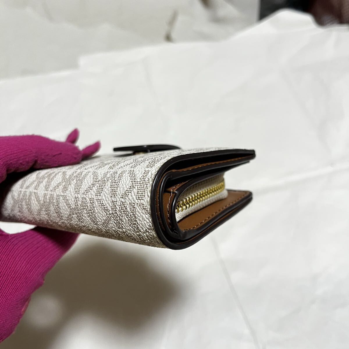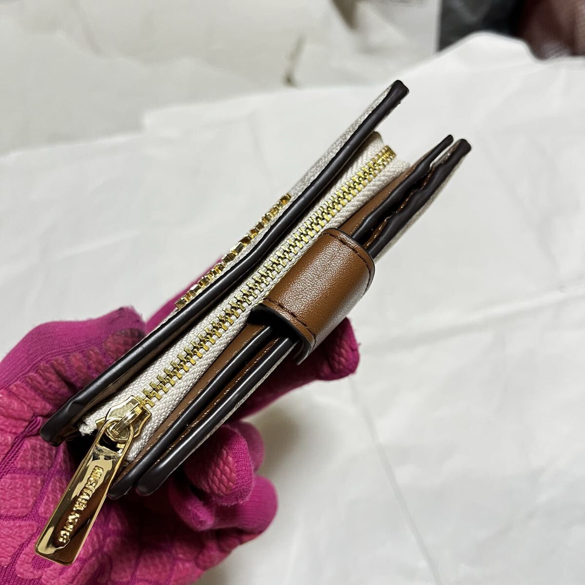 MKのモノグラム柄が上品な二つ折り財布。大きめの小銭入れに豊富なカードスロットで収納力◎飽きのこないでデザインは長く愛用頂けるアイテムです。