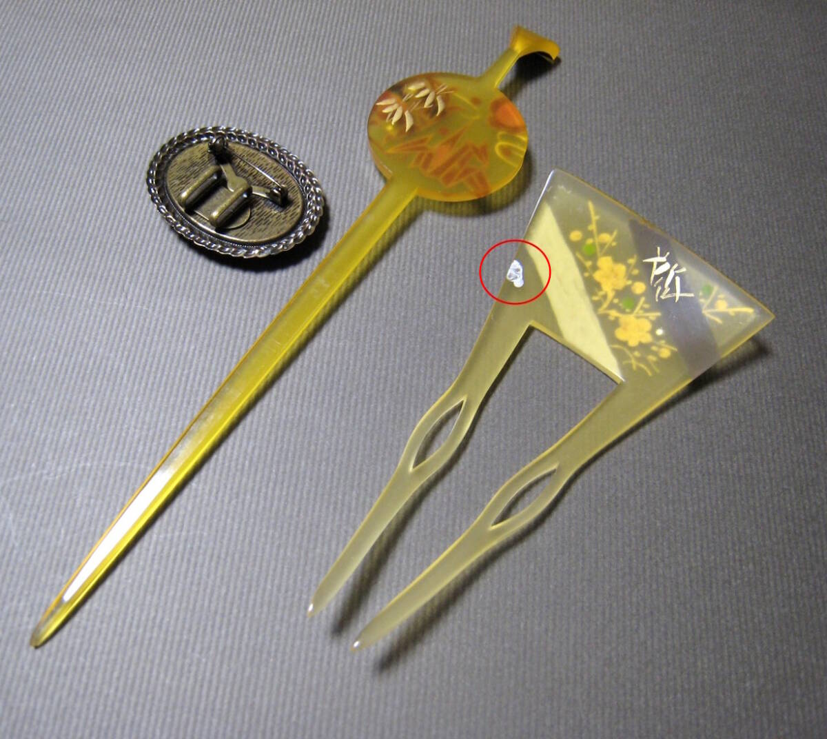 確認したところ大きな破損等はございませんでしたが、クスミ、小傷、汚れ等は多少ございます。また、バチ簪はお写真の様に裏面に彩色飛びがございます。
