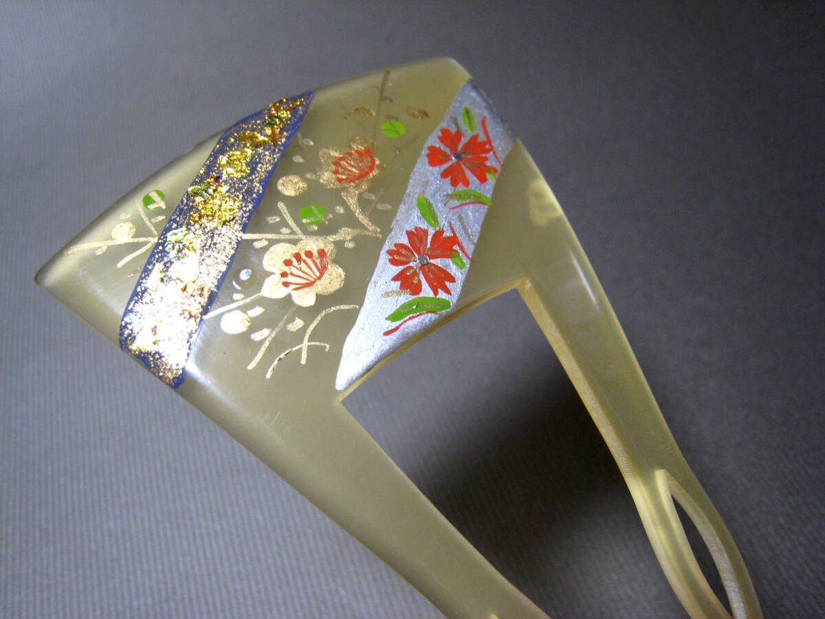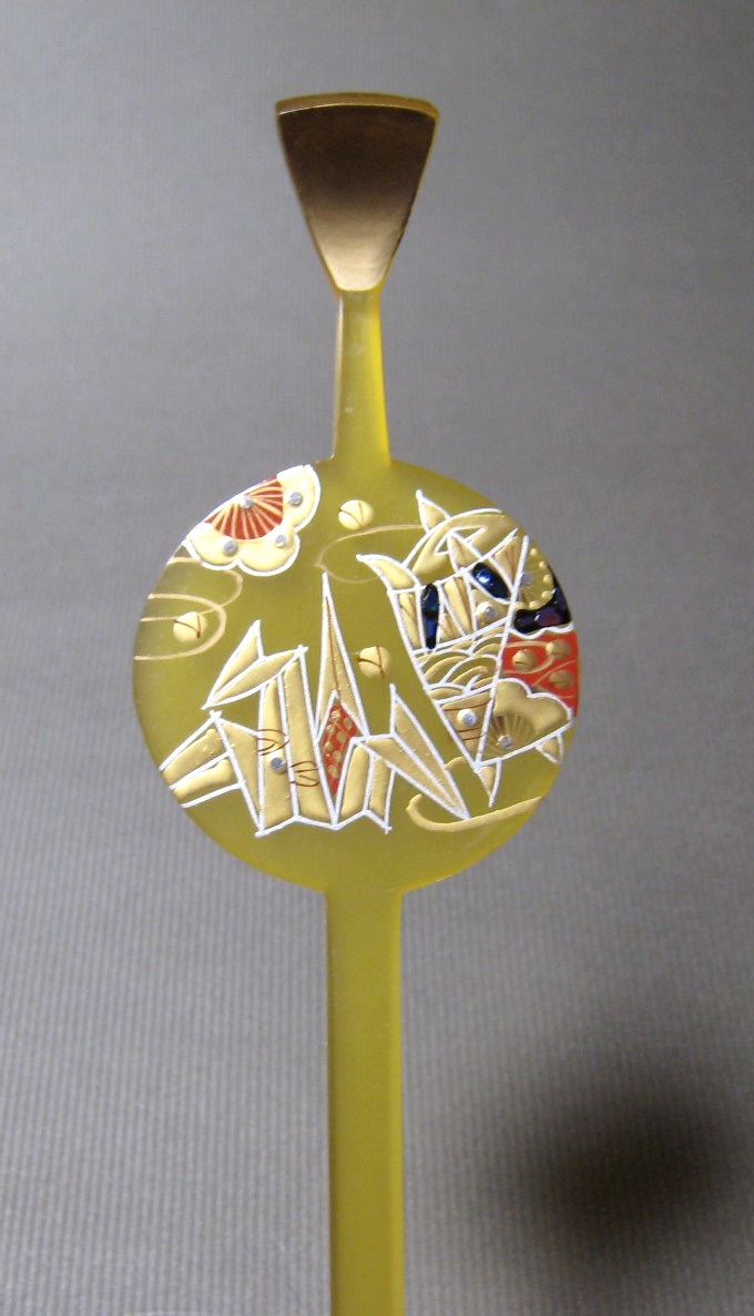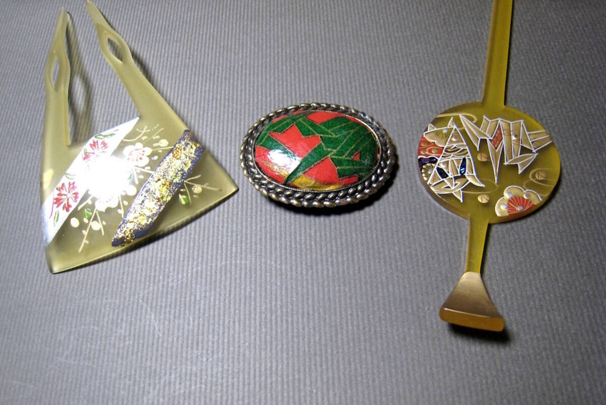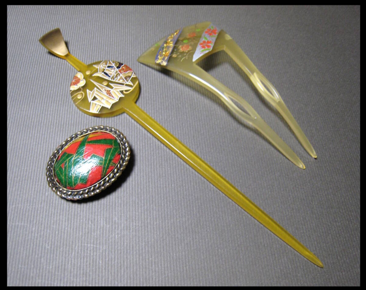 折り鶴蒔絵に螺鈿飾りのべっこう風の平簪と撫子、梅花文のべっこう風のバチ簪、折り鶴模様のレザークラフトの帯留(ブローチ兼用)の3点です。