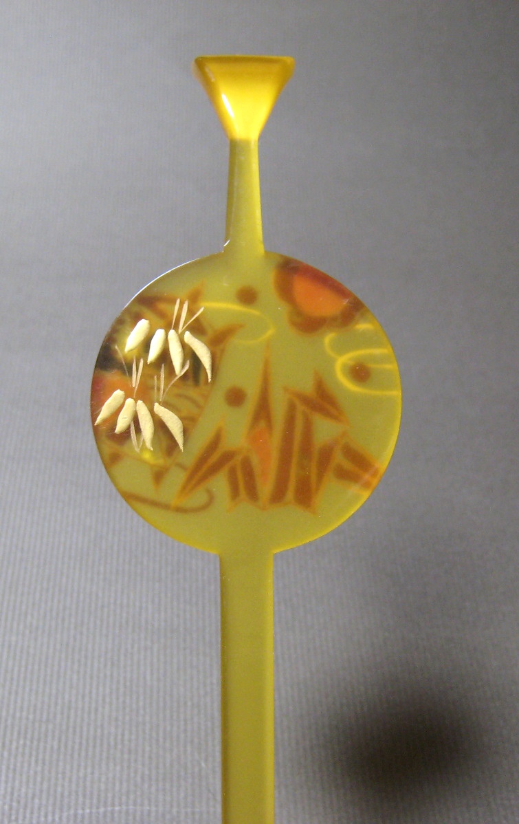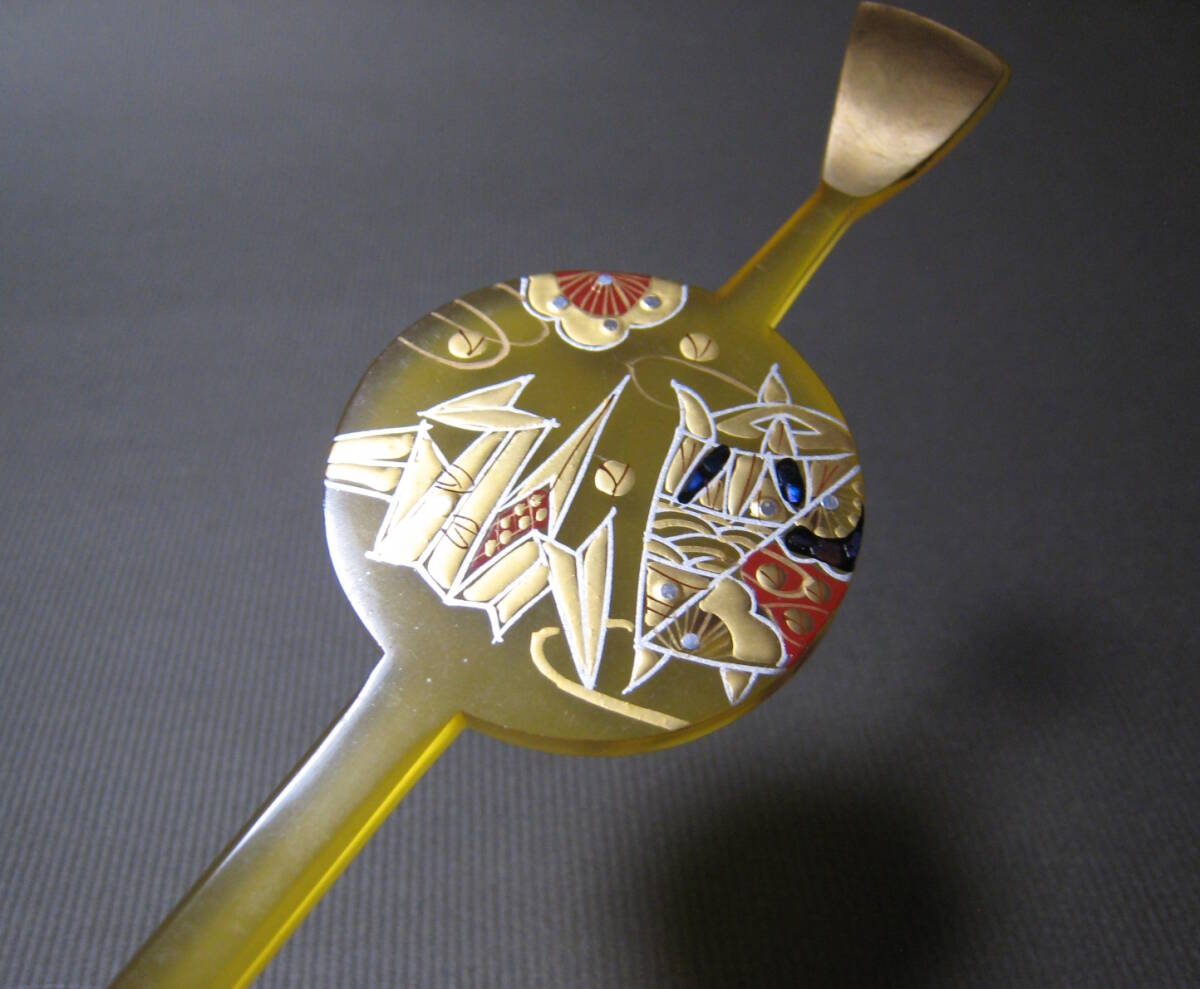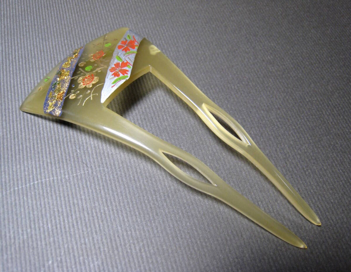 折り鶴蒔絵に螺鈿飾りのべっこう風の平簪と撫子、梅花文のべっこう風のバチ簪、折り鶴模様のレザークラフトの帯留(ブローチ兼用)の3点です。