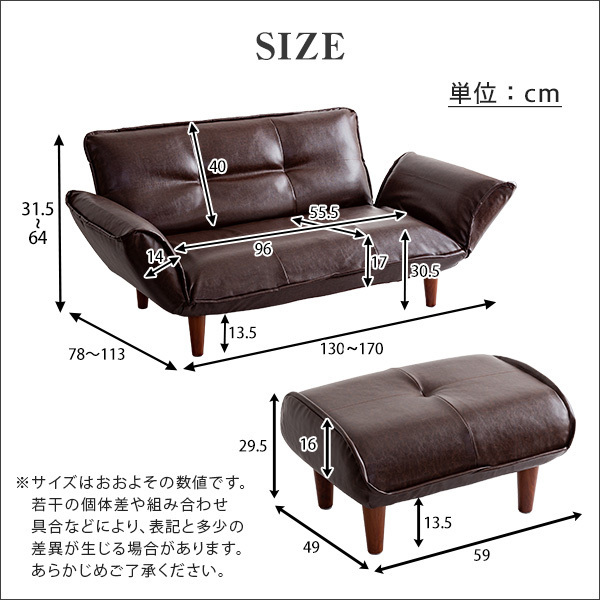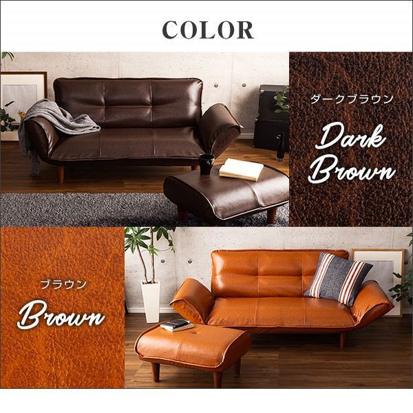 【カラー】 ブラウン、ダークブラウン 【サイズ】 2人掛け 130~170x78~113x64cm オットマン 59x49x29.5cm 【重量】 2人掛け 15kg オットマン 4kg 【素材】 構造部材:スチールパイプ、ポケットコイルスプリング、樹脂脚 中材:ウレタンフォーム 生地組成:合成皮革(PVCレザー) 【梱包】 2人掛け サイズ:125x50x63cm、重量:16.5kg オットマン サイズ:46x16x66cm、重量:5kg 【完成品】 脚のみお客様取り付けです。 【ご注意】 ・サイズ、重量は概算です。 ・商品カラーはご使用のモニターによって実際の明るさや色と異なって見える場合がございます。 |
