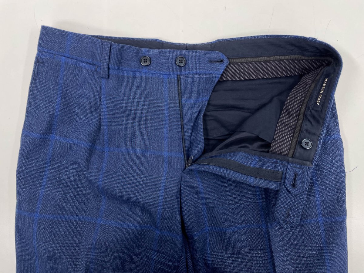 ・スラックス・・・ウエスト実寸約80センチ(2センチ出し、4センチ詰め可能)、股上約24センチ、渡り幅約30~31センチ、股下約65センチ、総丈約88センチ、裾幅約19センチ、ダブル仕上げ(ダブル幅4.5センチ、最大で10センチ出しが可能です)