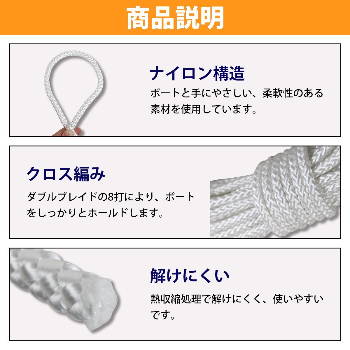 ボートをはじめ、マリンレジャーや漁業用には欠かせないロープです。