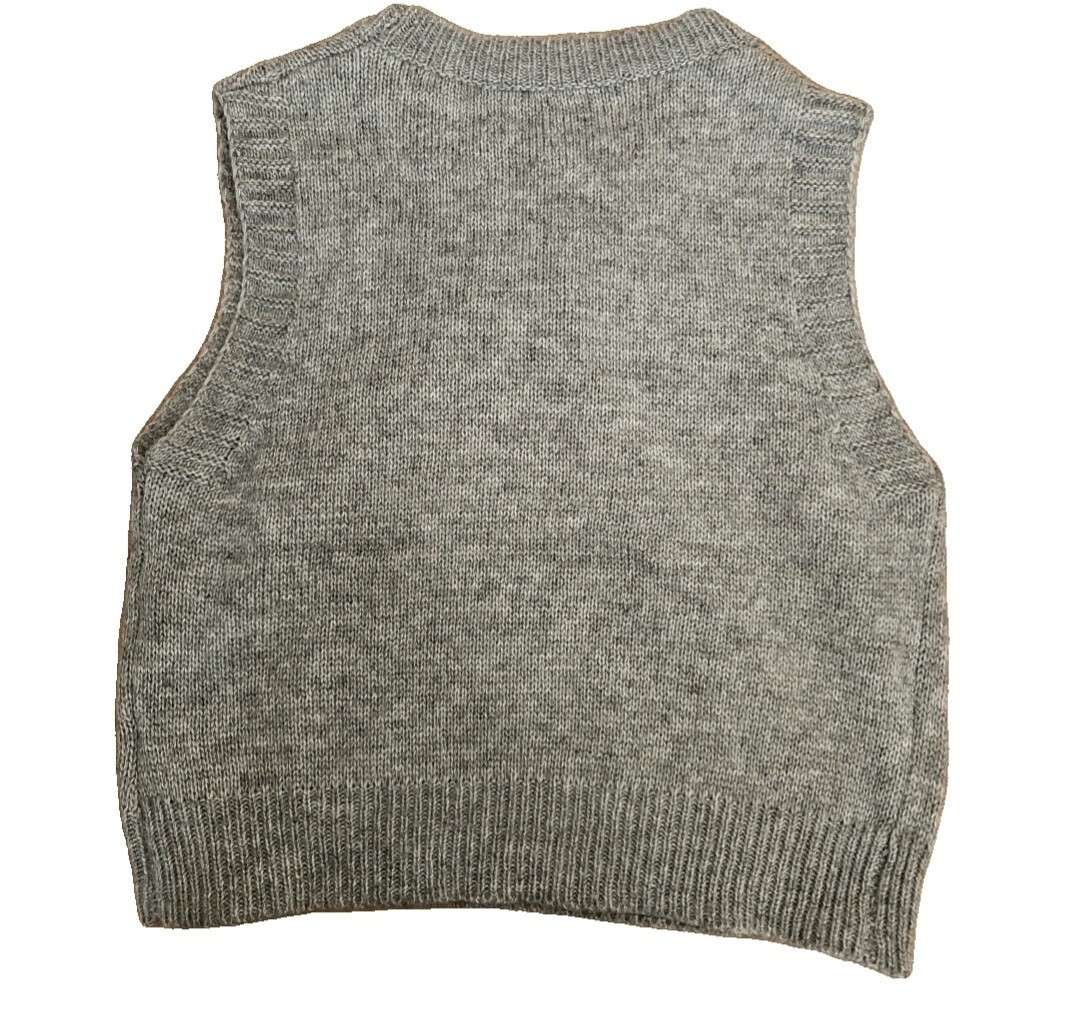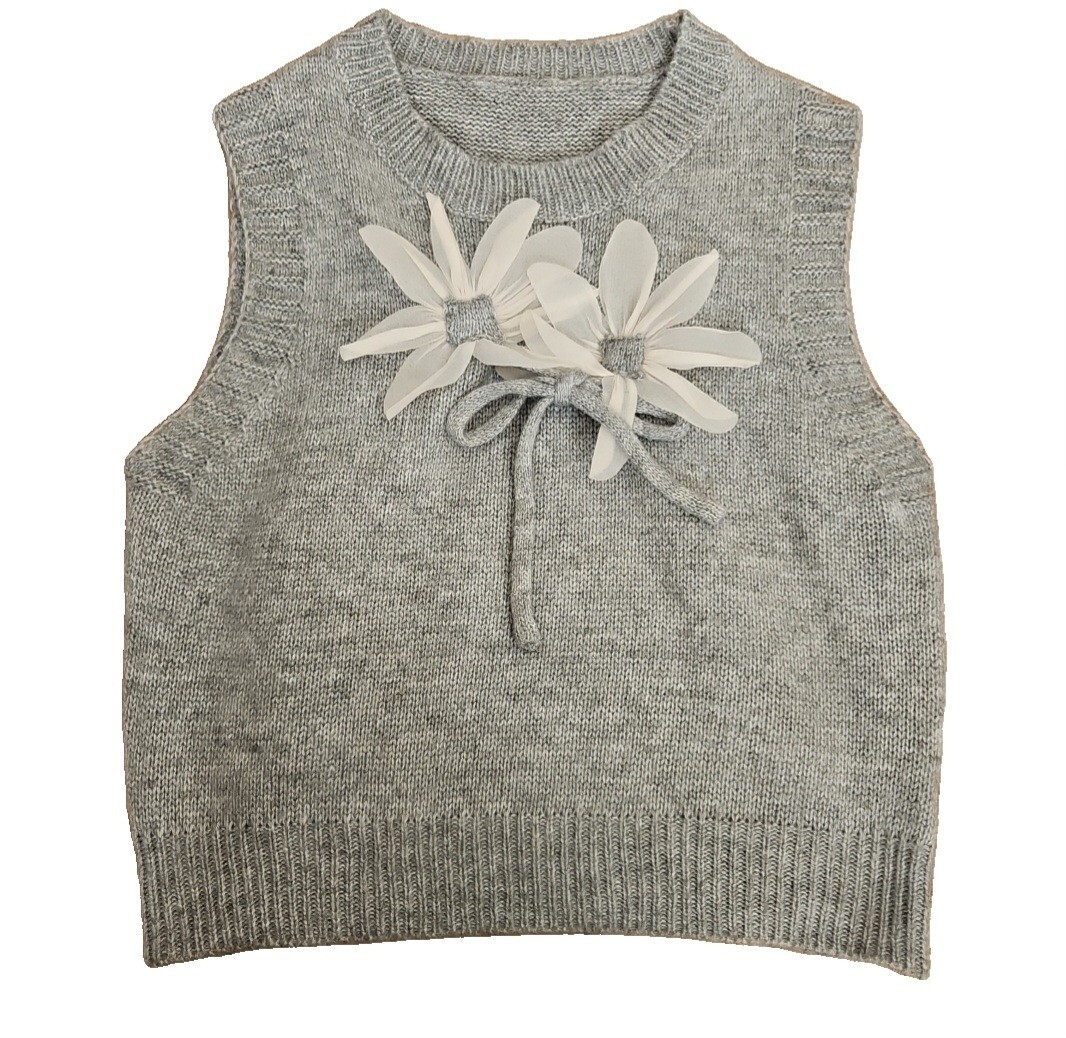花飾りが特徴的なグレーのノースリーブニットベスト。
