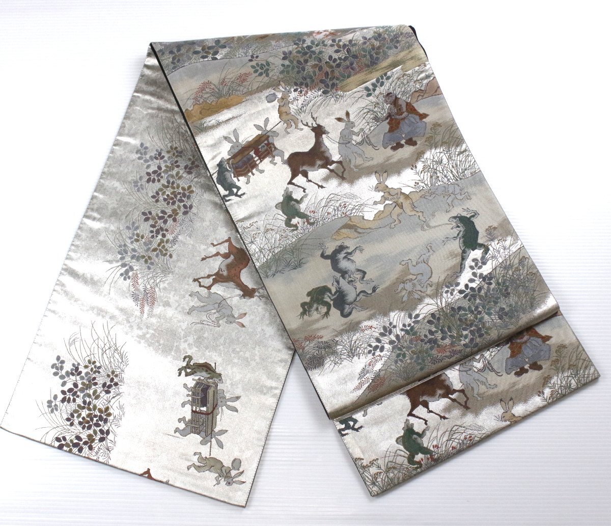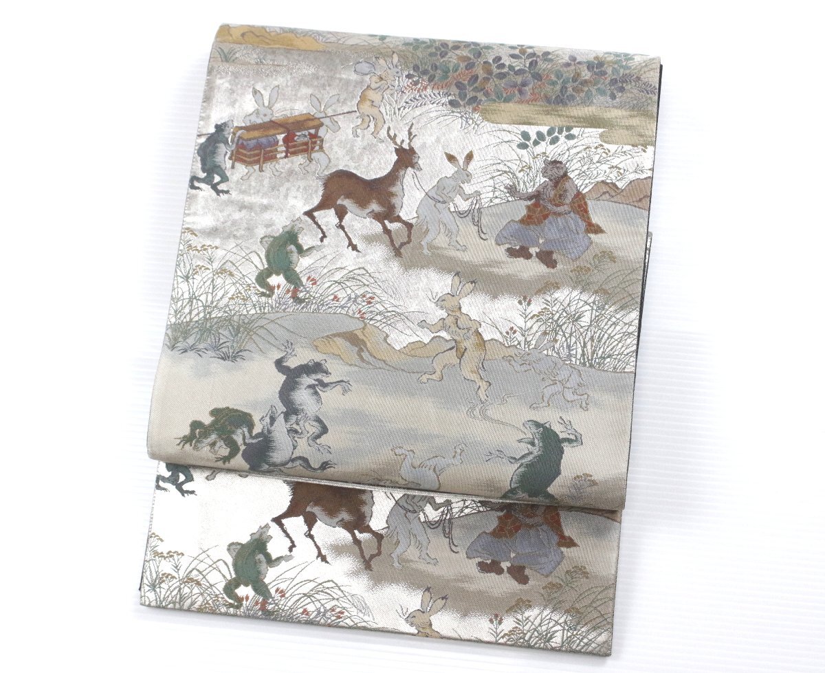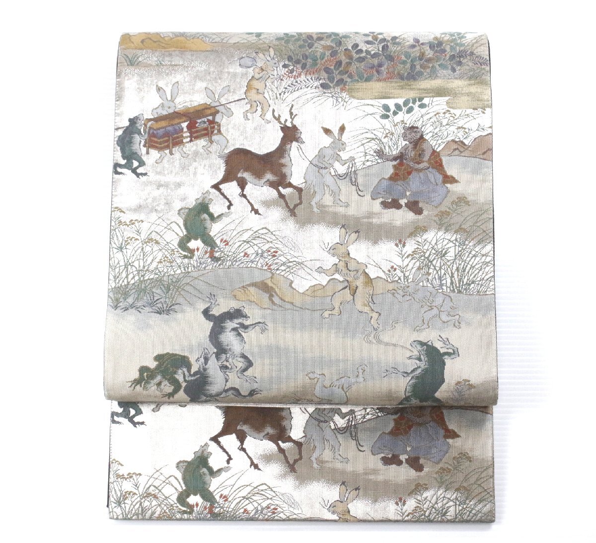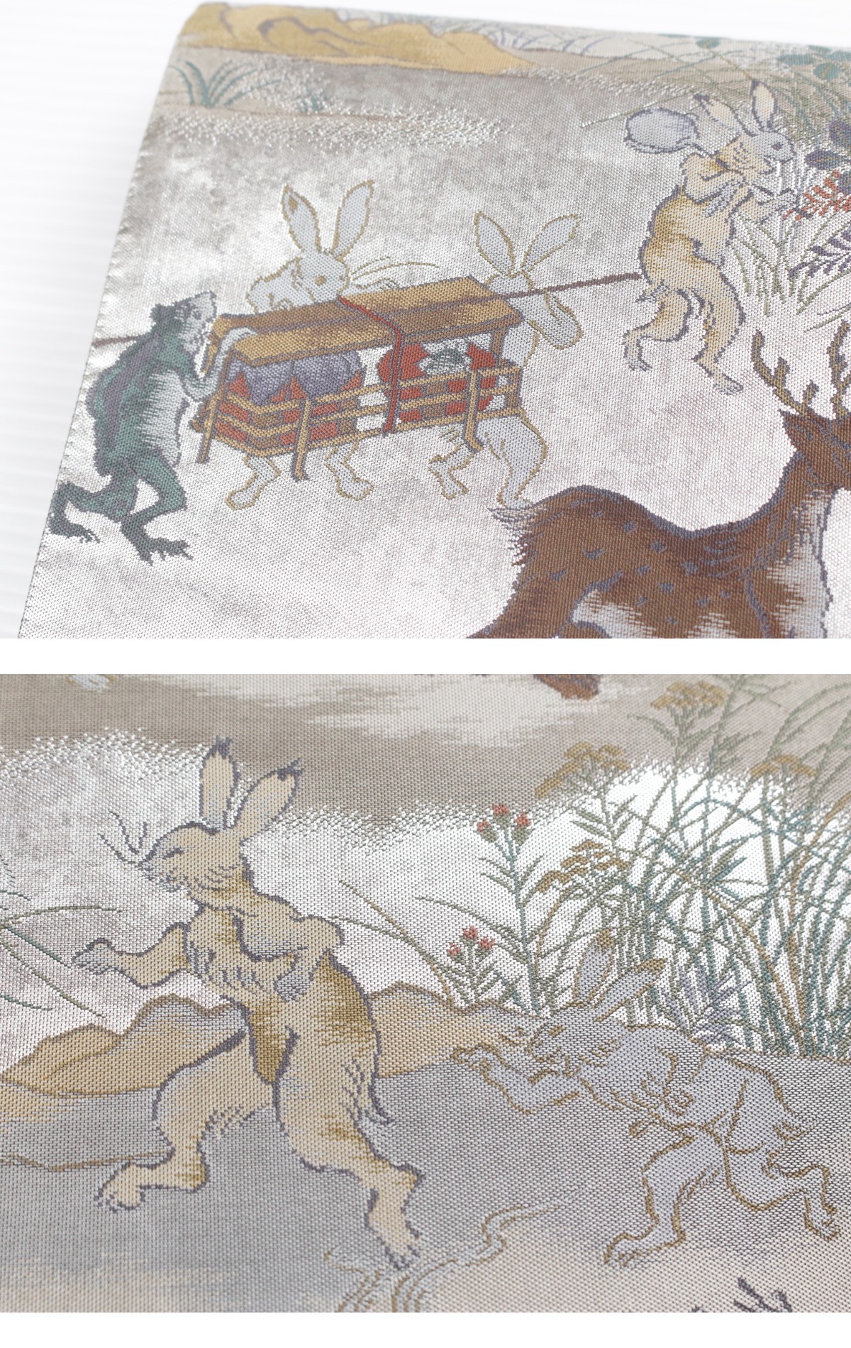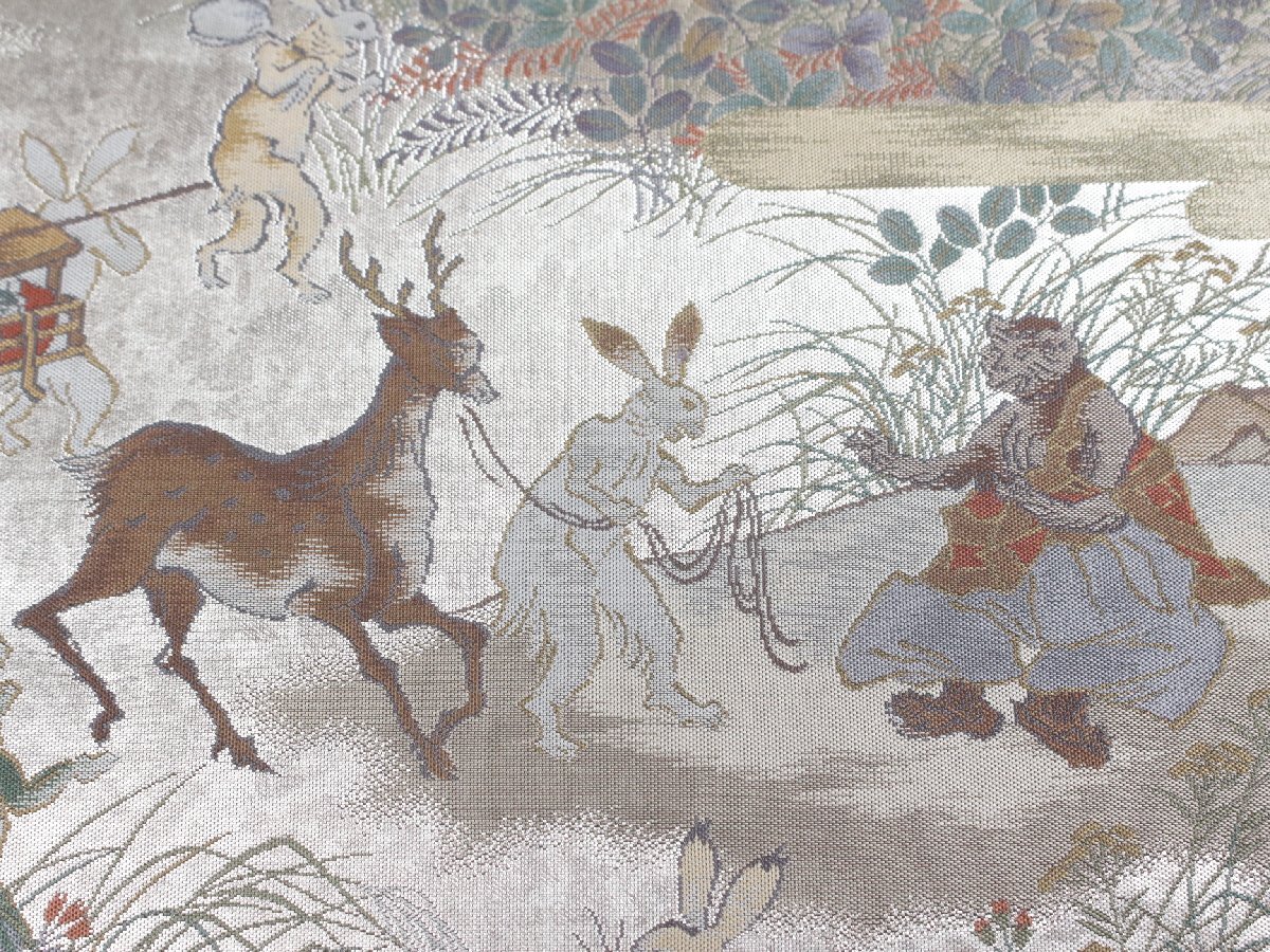 遊び心あふれるお洒落な正絹袋帯のご紹介です。 日本最古の漫画とも称される『鳥獣人物戯画』を帯一面に織り出した、遊び心あふれる魅力的な一本です。 ウサギやカエル、シカ、猿などの動物たちが生き生きと動き、物語を繰り広げる姿が細やかな織りで表現されています。 柔らかい銀地に落ち着いた色調の動物たちが映え、しっとりと品のある雰囲気を保ちながらも、帯姿にユーモアと洒落味を添えてくれます。草花の描線も繊細で、自然の風景と愛嬌ある動きが調和した美しい意匠です。 小紋・紬・色無地などの洒落着との相性が良く、お食事会、観劇、美術館巡りなど、こだわりのお出かけにぴったり。 古典文化の風情と楽しさを同時に味わえる、装いを軽やかに彩るお品。ぜひこの機会にお手元にお迎えください。 ※撮影時の部屋の照明によって画像の色に若干の差がございます。色味に差がございますことをご了承のうえご検討下さいませ。 …状態… 締め跡あり。 ※全くの新品ではございませんので、記載のない変色やスレ、ヤケ、その他僅かな難がある場合がございます。そのような理由でのキャンセルはお受けできませんので、ご了承の上ご検討お願いいたします。 |