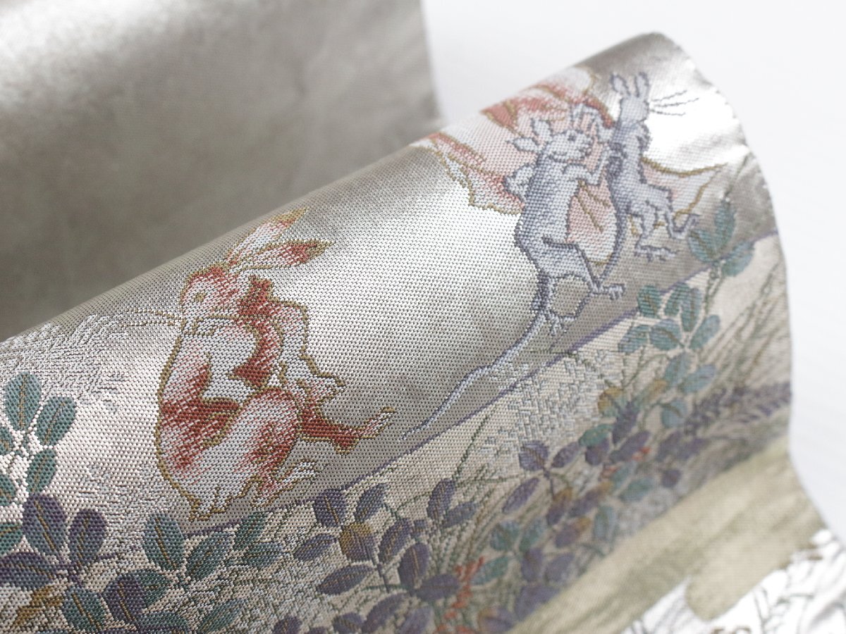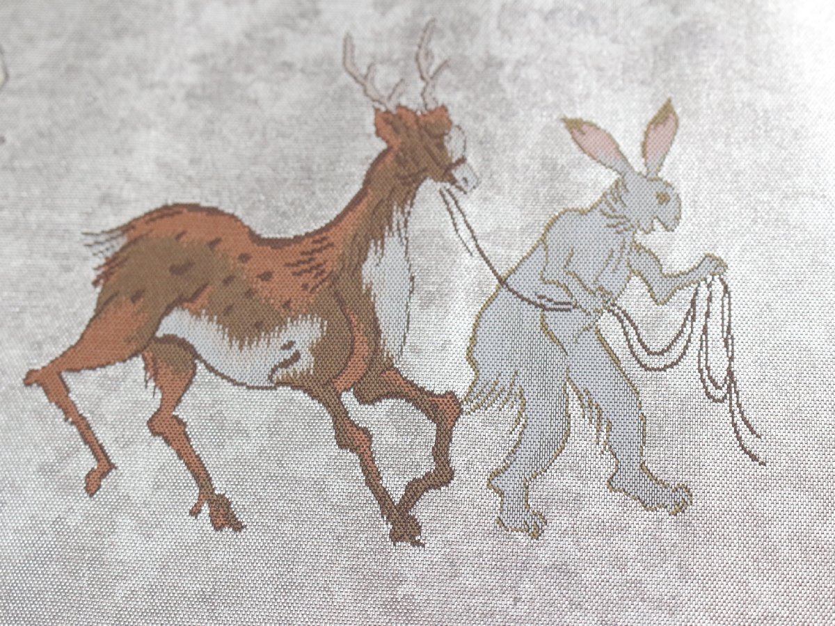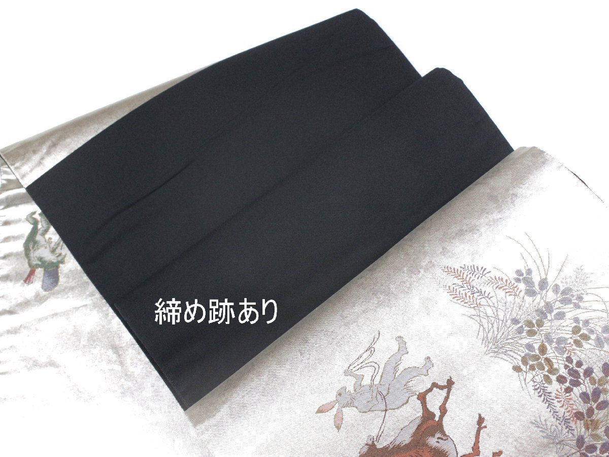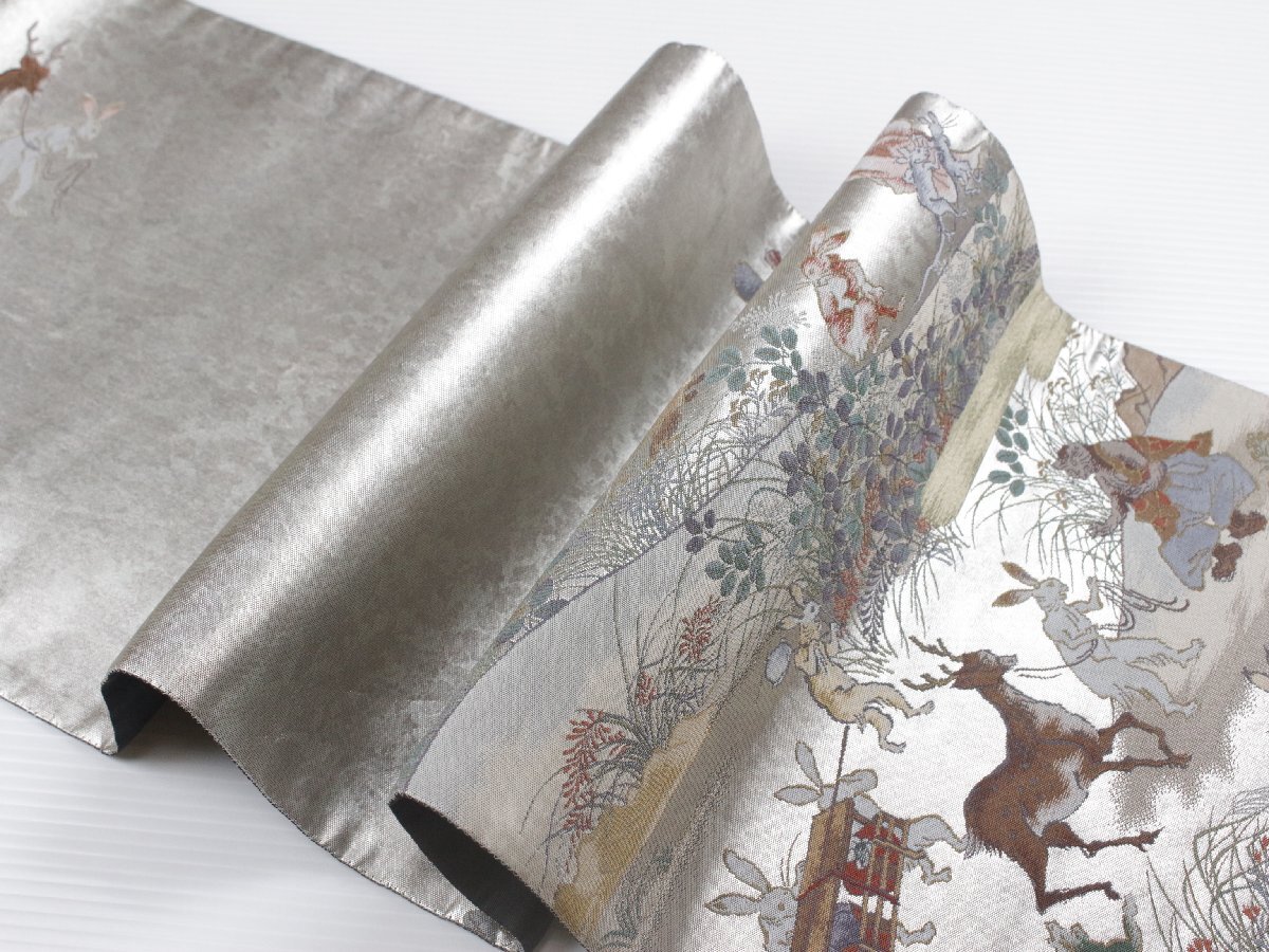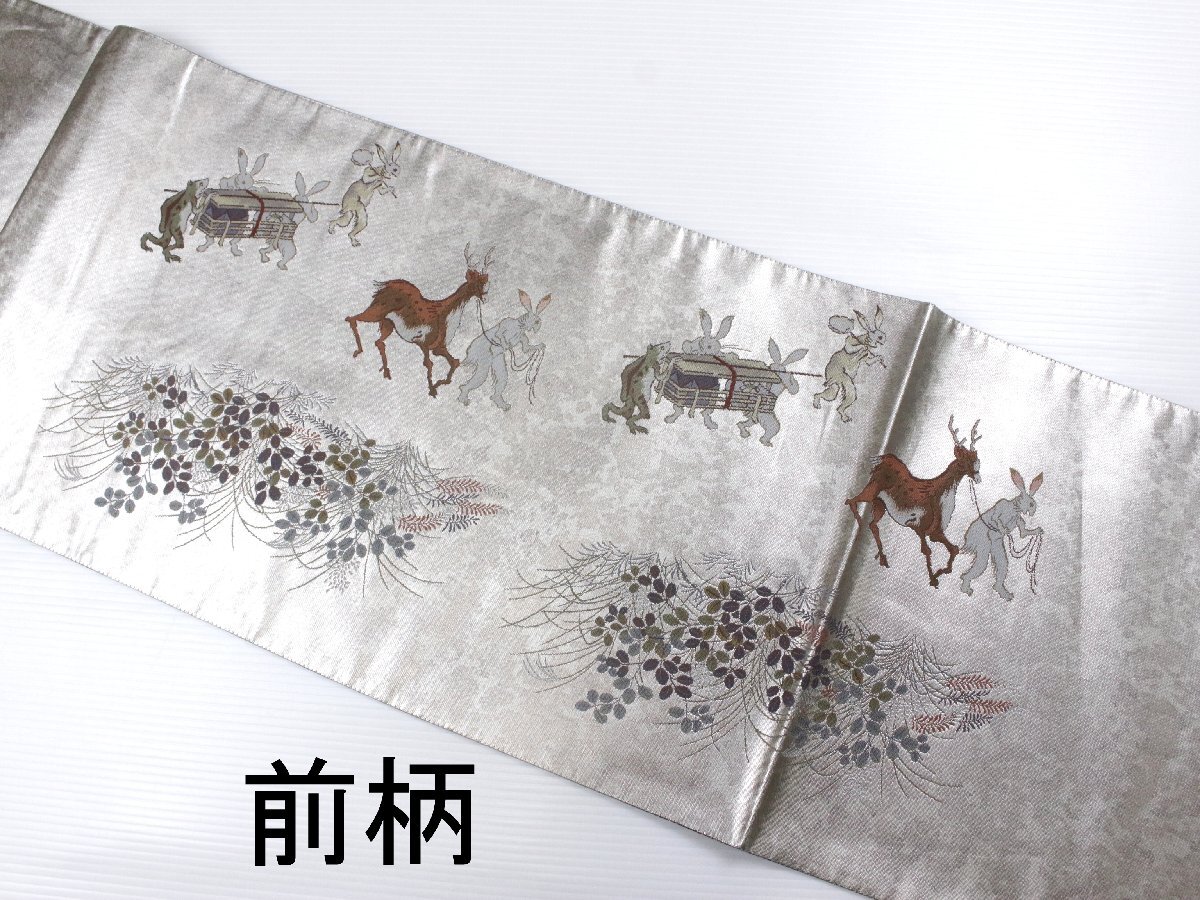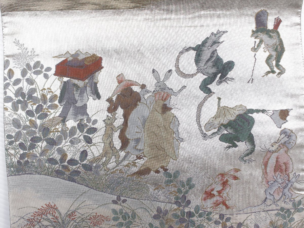 遊び心あふれるお洒落な正絹袋帯のご紹介です。 日本最古の漫画とも称される『鳥獣人物戯画』を帯一面に織り出した、遊び心あふれる魅力的な一本です。 ウサギやカエル、シカ、猿などの動物たちが生き生きと動き、物語を繰り広げる姿が細やかな織りで表現されています。 柔らかい銀地に落ち着いた色調の動物たちが映え、しっとりと品のある雰囲気を保ちながらも、帯姿にユーモアと洒落味を添えてくれます。草花の描線も繊細で、自然の風景と愛嬌ある動きが調和した美しい意匠です。 小紋・紬・色無地などの洒落着との相性が良く、お食事会、観劇、美術館巡りなど、こだわりのお出かけにぴったり。 古典文化の風情と楽しさを同時に味わえる、装いを軽やかに彩るお品。ぜひこの機会にお手元にお迎えください。 ※撮影時の部屋の照明によって画像の色に若干の差がございます。色味に差がございますことをご了承のうえご検討下さいませ。 …状態… 締め跡あり。 ※全くの新品ではございませんので、記載のない変色やスレ、ヤケ、その他僅かな難がある場合がございます。そのような理由でのキャンセルはお受けできませんので、ご了承の上ご検討お願いいたします。 |