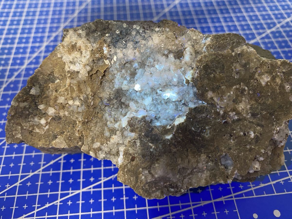透明度が高い部分が魚眼石、白く濁った部分が方解石になります。 方解石は青白く蛍光します。