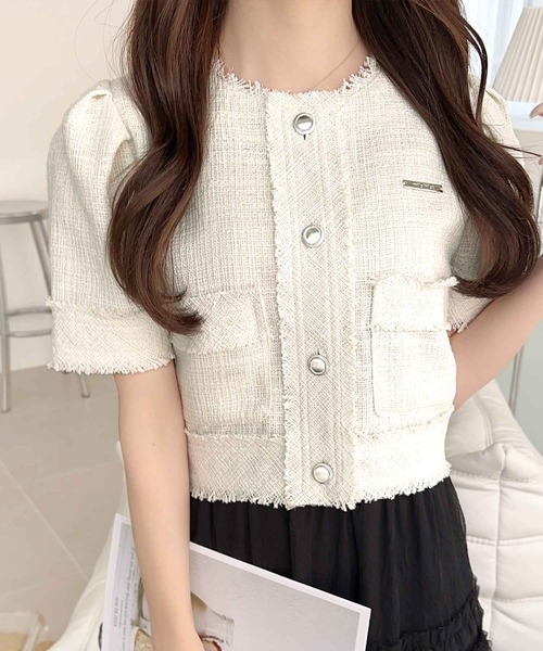 参考商品名:【mily bilet】きらめくツイードに、ときめきを。ロゴプレート使い半袖ラメ入りツイードジャケット
