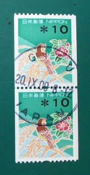珍   10円コイル 縦ペア 青アゴ付  GIFU 20.IX.00 8-12 JAPAN   初期使用  美品 使用済