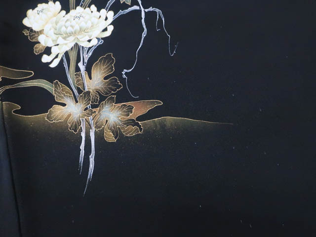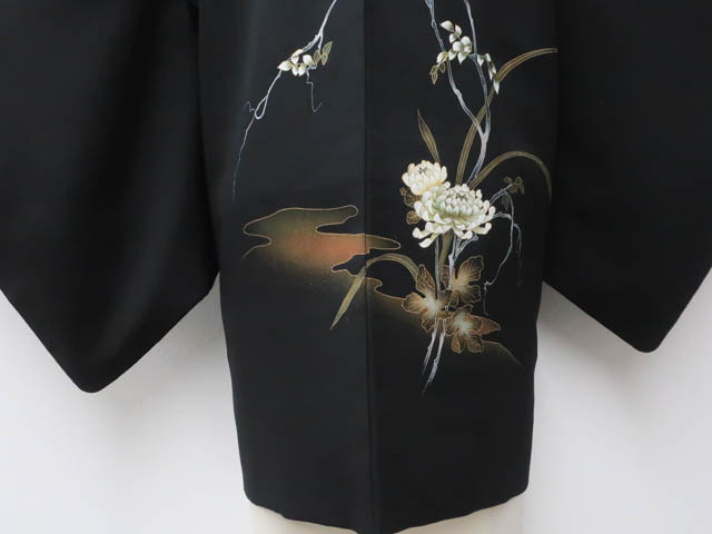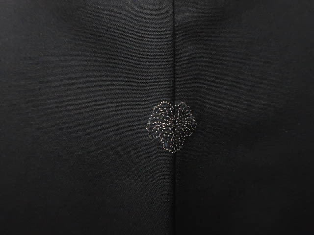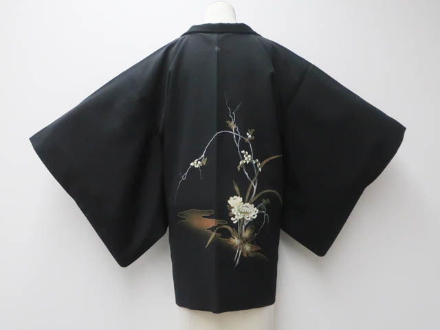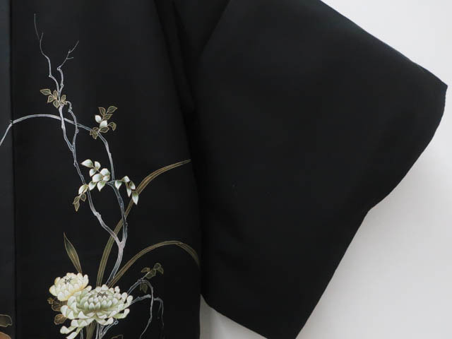 《京都一輝堂》【着物】黒羽織 縫い紋 絵羽柄 花文 羽織紐別売り 身丈約80cm 裄丈約62.5cm 25z04-2242