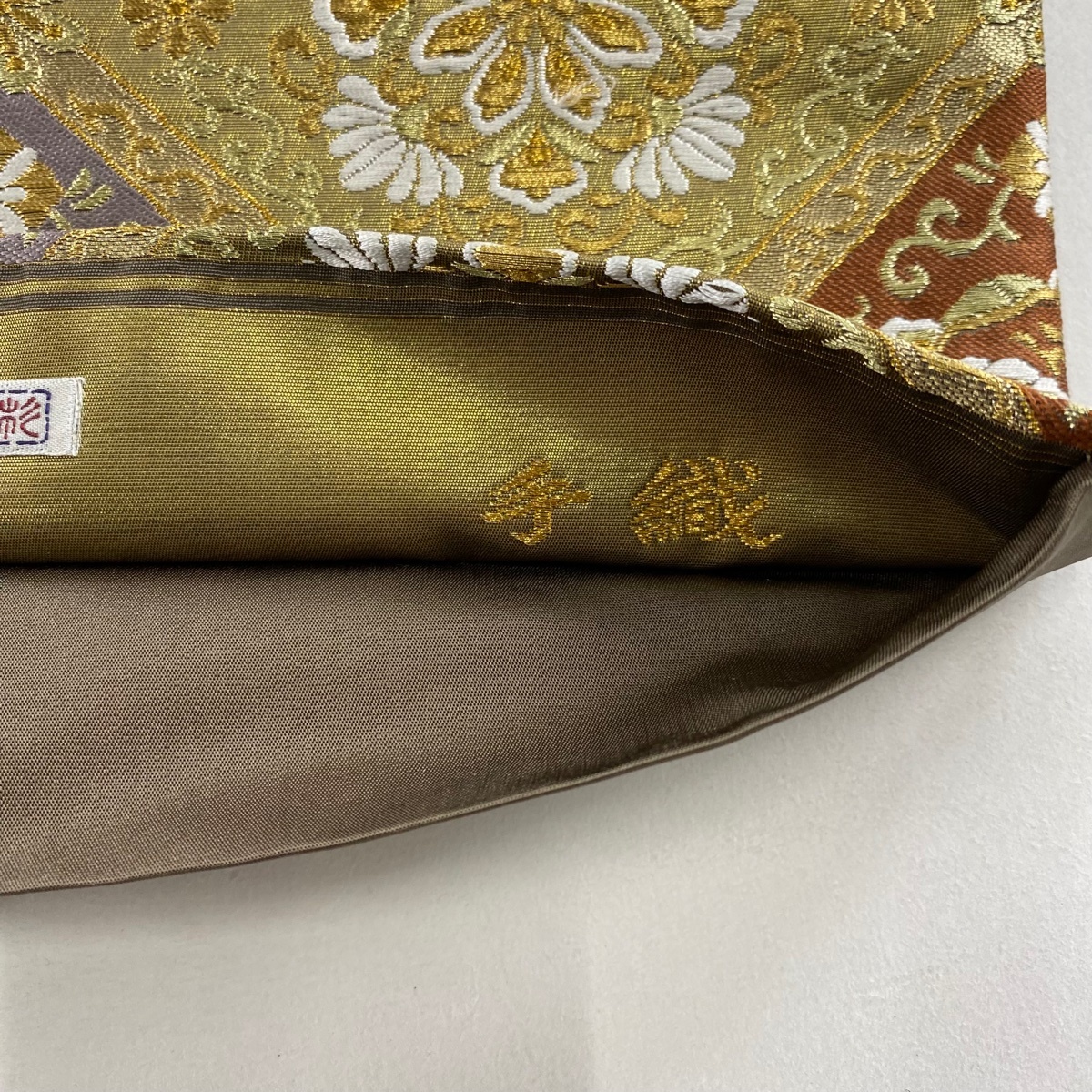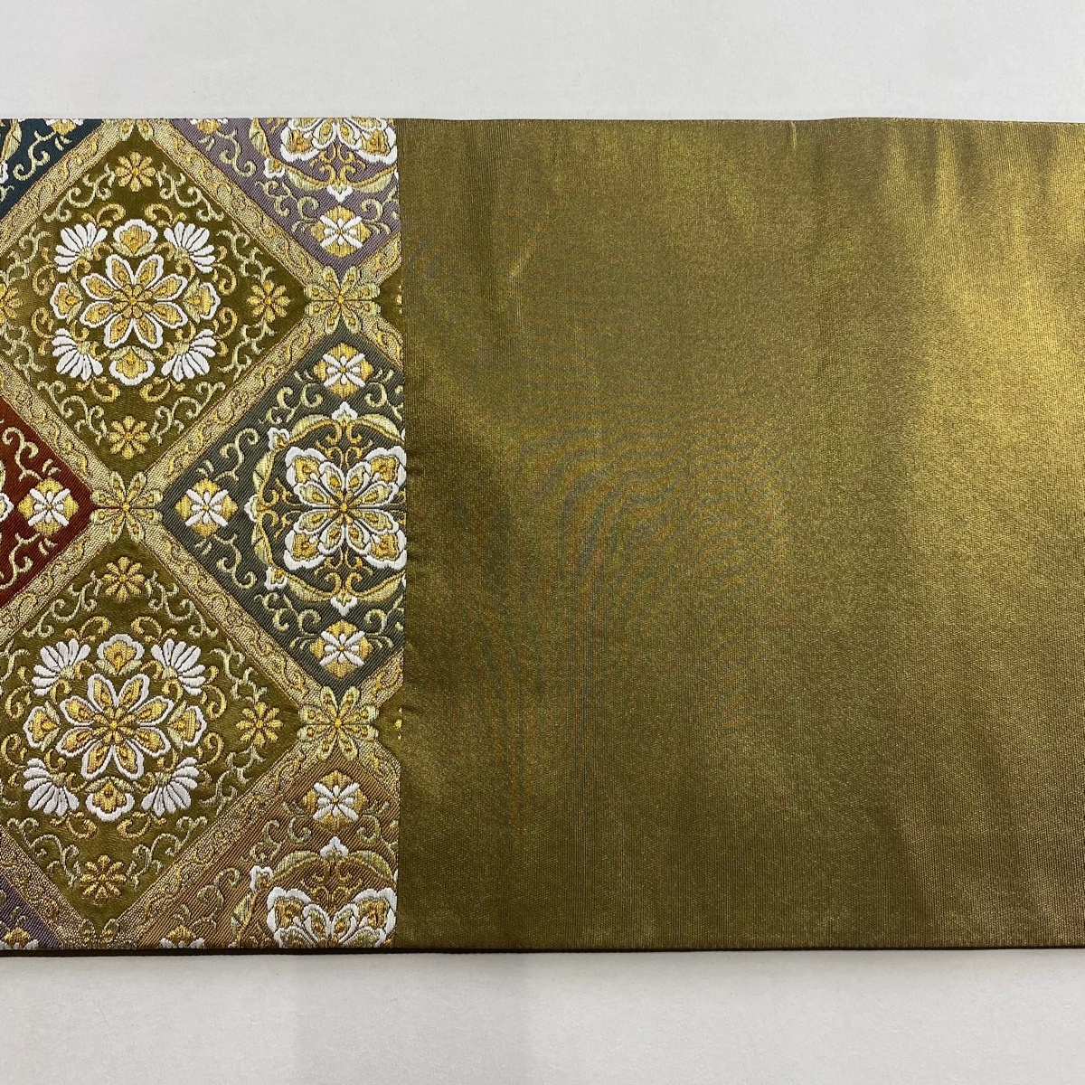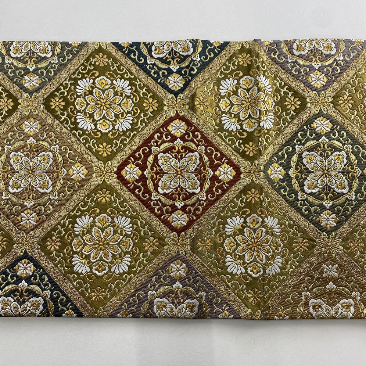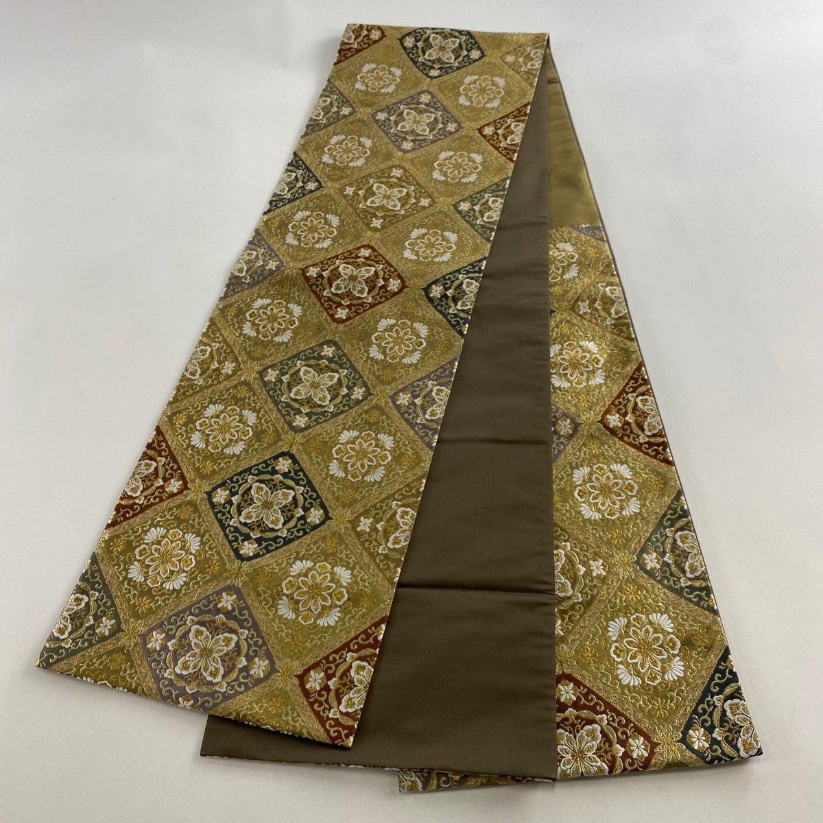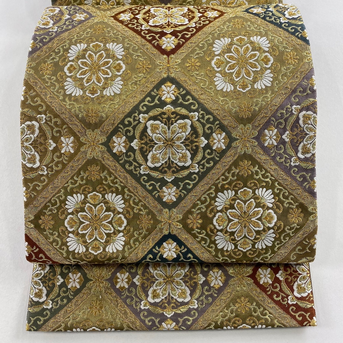 | 袋帯 美品 名品 華文 花唐草 金糸 箔 茶緑色 六通 正絹 【中古】 |