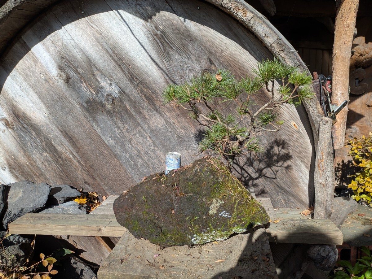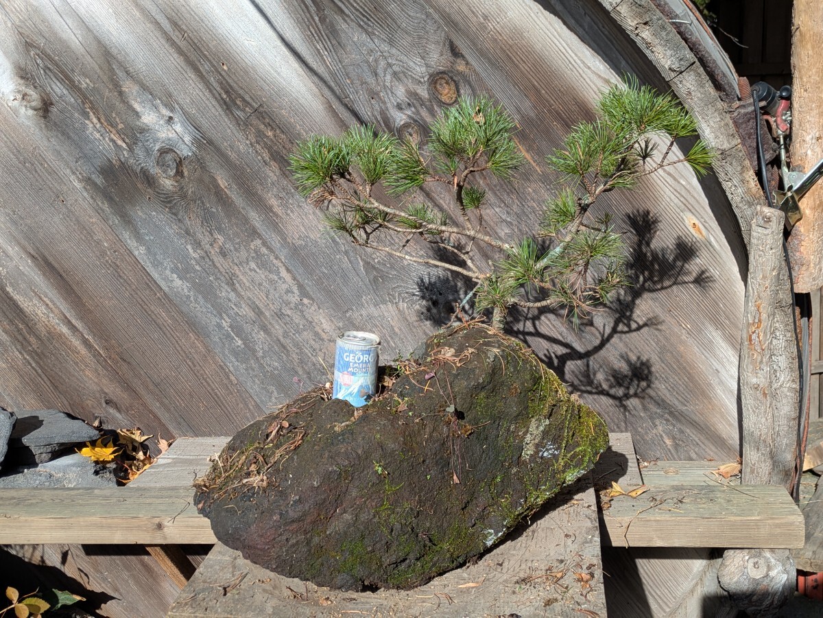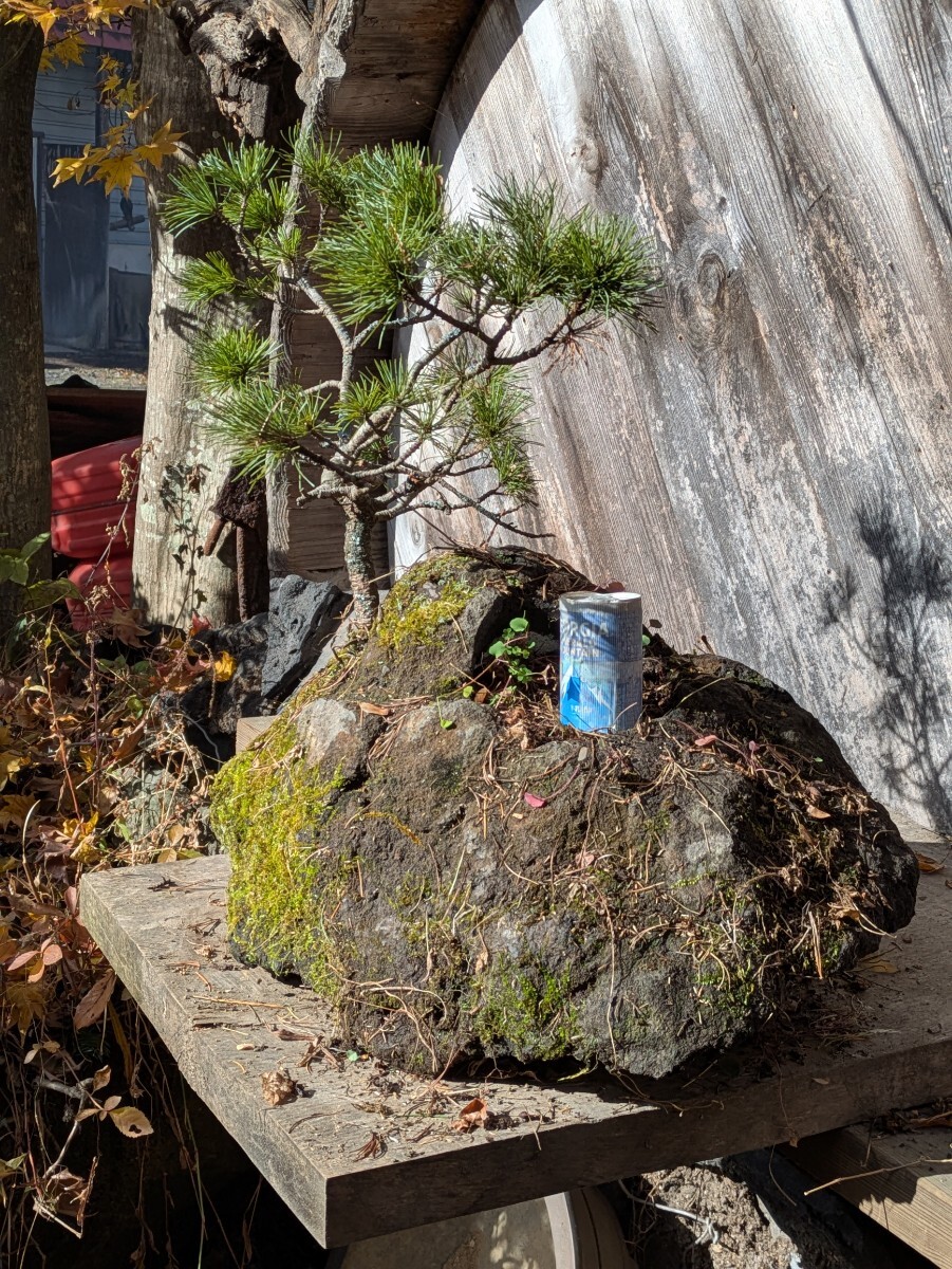 およそは50x60x50cmの枠に入るサイズ。当地は山奥で遠くに見える標高2000mくらいの山々に這い松は生えてますが この這い松は大雪山系との事で15年以上前に北海道から宅急便で苗を送ってもらった木です。浅間山の溶岩に鉢を掘り植えて現在に至ります。木の生えてる部分と缶の乗って部分が石の中で繋がっており 缶の乗ってる部分に水やりする様になってます。長年の石鉢なので割れヒビが有るかも知れません。(無さそうですけど)発送梱包の際に痛むヶ所が有るかもしれません。佐川急便にて発送する事も有ります。