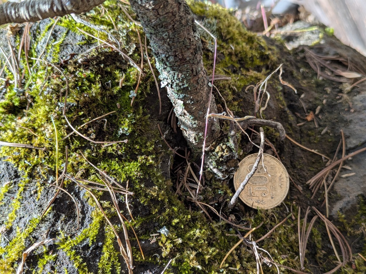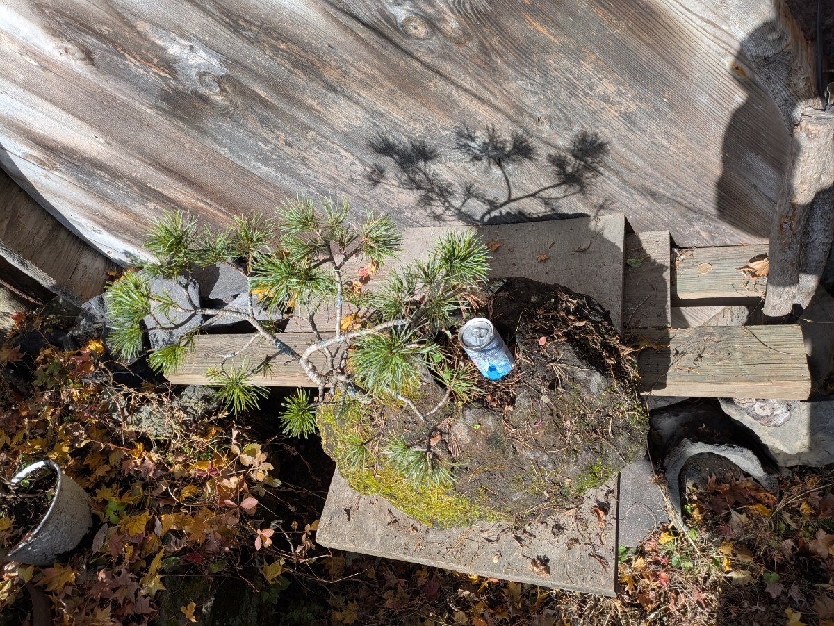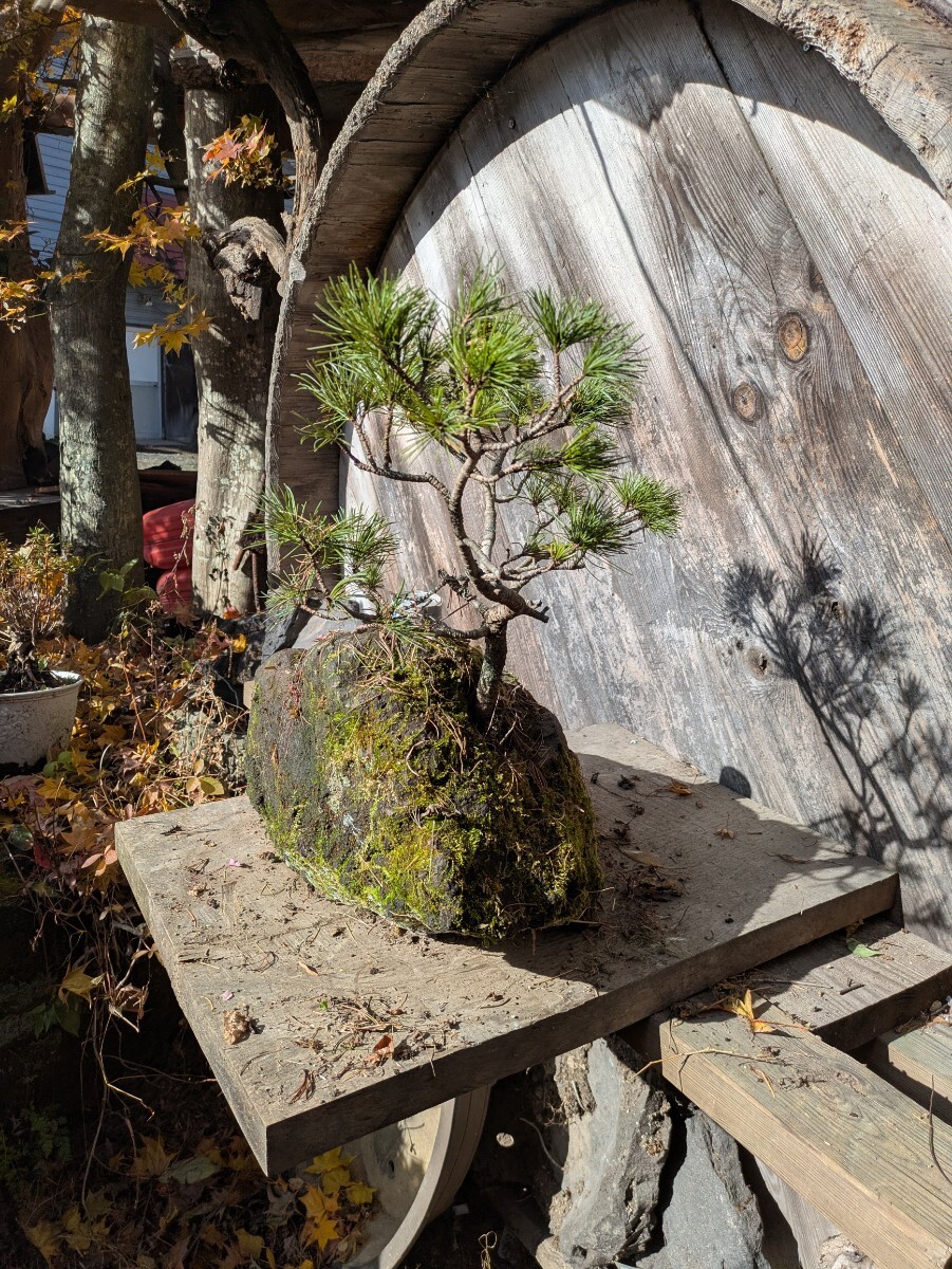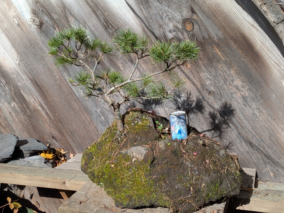 およそは50x60x50cmの枠に入るサイズ。当地は山奥で遠くに見える標高2000mくらいの山々に這い松は生えてますが この這い松は大雪山系との事で15年以上前に北海道から宅急便で苗を送ってもらった木です。浅間山の溶岩に鉢を掘り植えて現在に至ります。木の生えてる部分と缶の乗って部分が石の中で繋がっており 缶の乗ってる部分に水やりする様になってます。長年の石鉢なので割れヒビが有るかも知れません。(無さそうですけど)発送梱包の際に痛むヶ所が有るかもしれません。佐川急便にて発送する事も有ります。