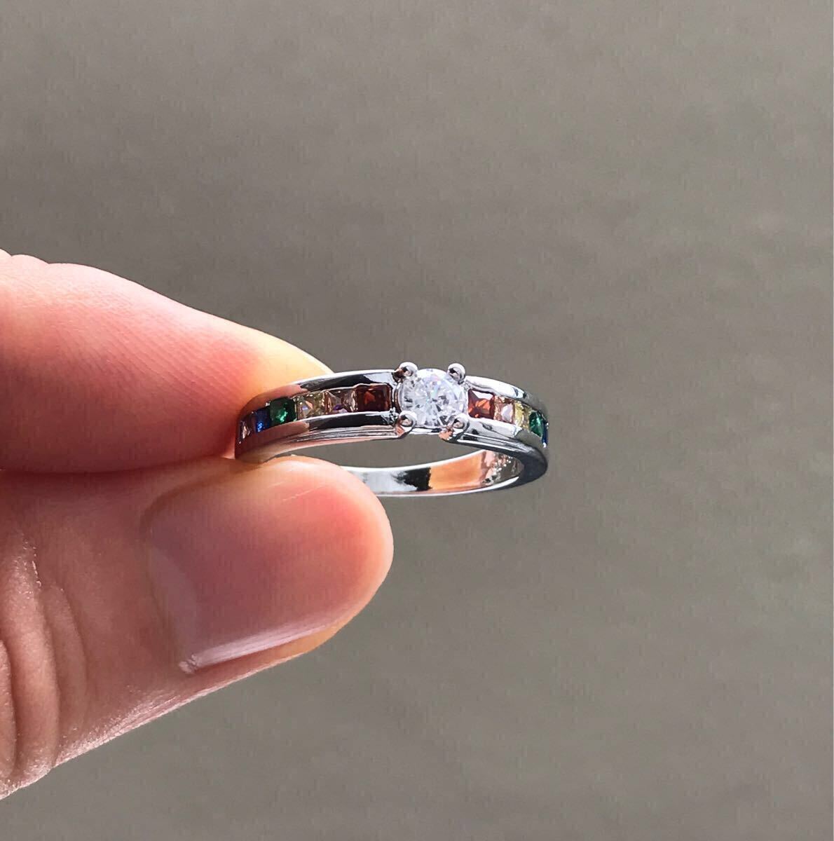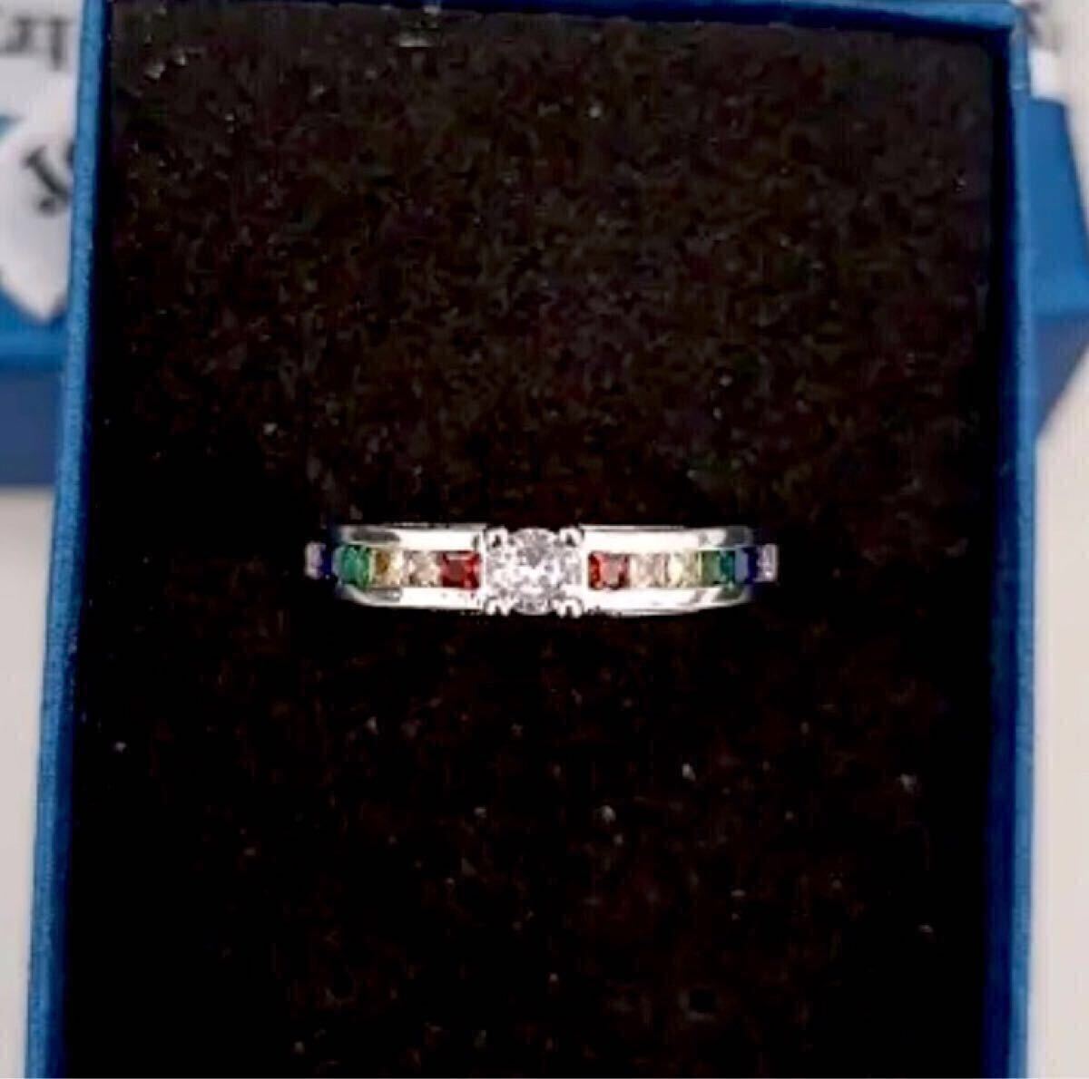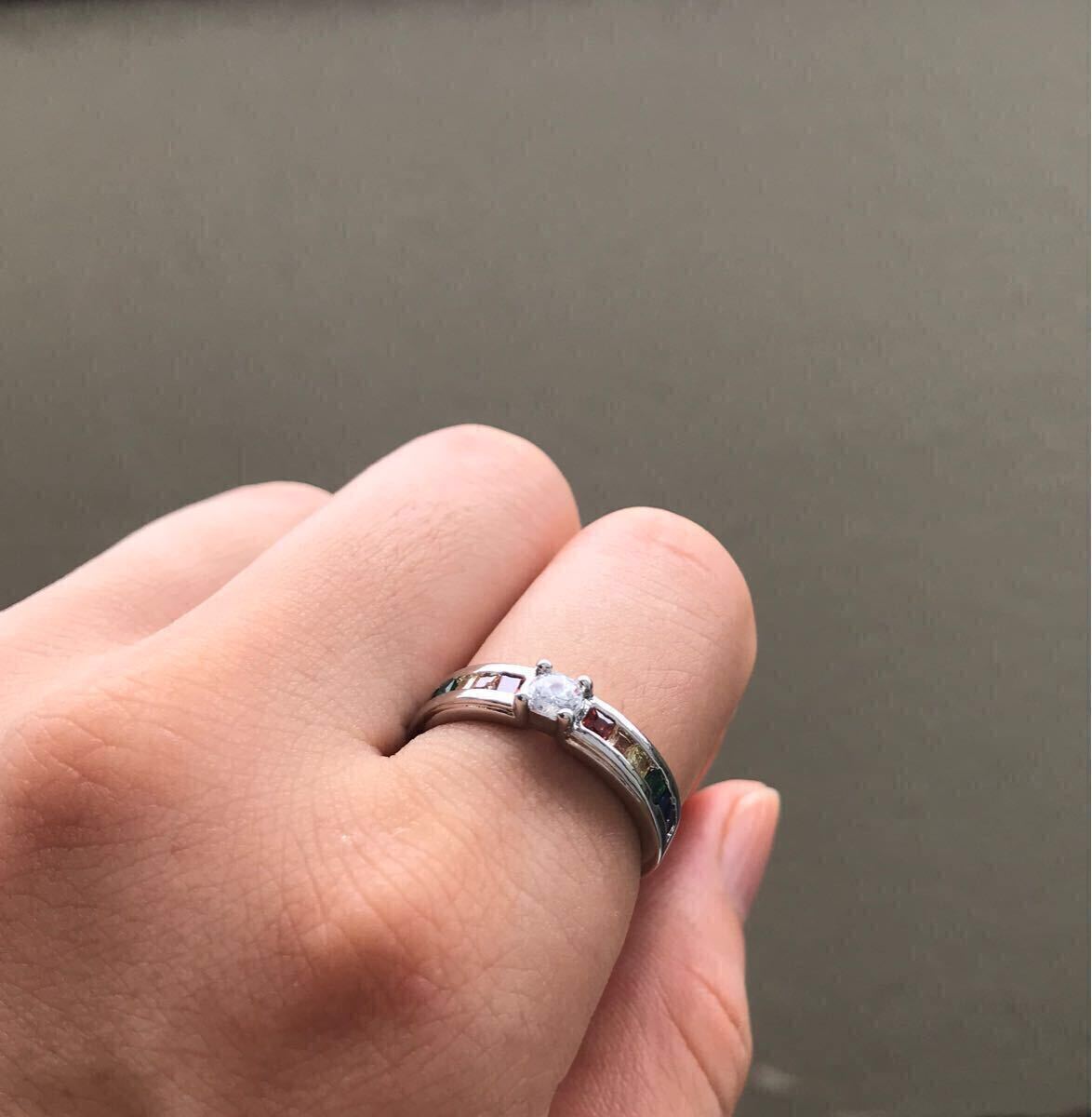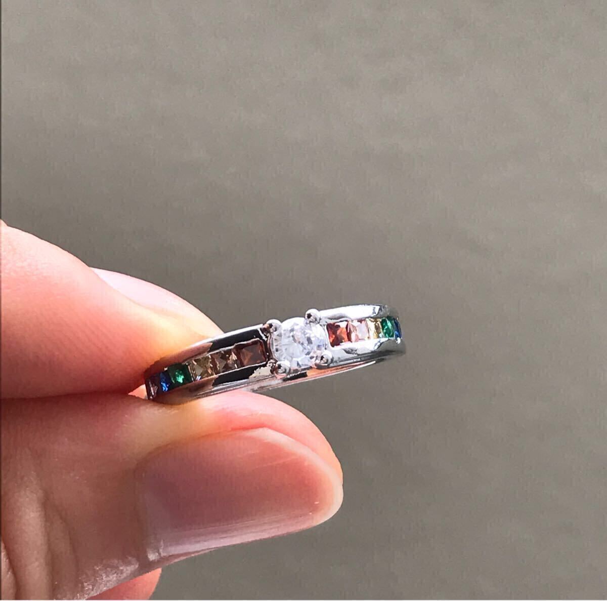 中央の大粒CZダイヤモンドと両サイドを彩るレインボーカラーのCZクリスタルが華やかなリングです。お好みのファッションに合わせてお楽しみください。