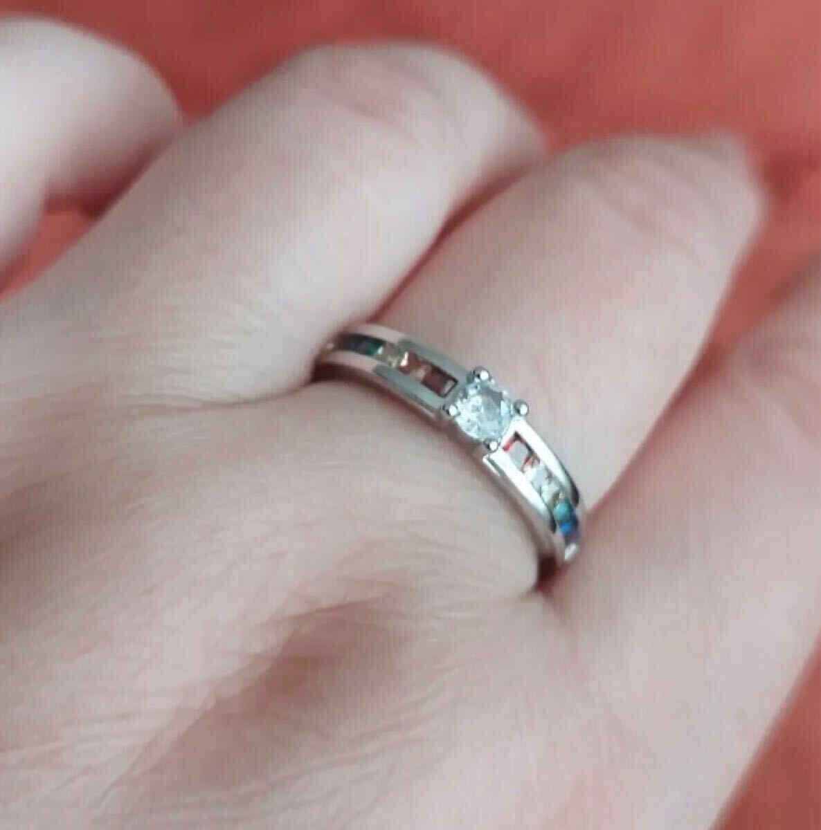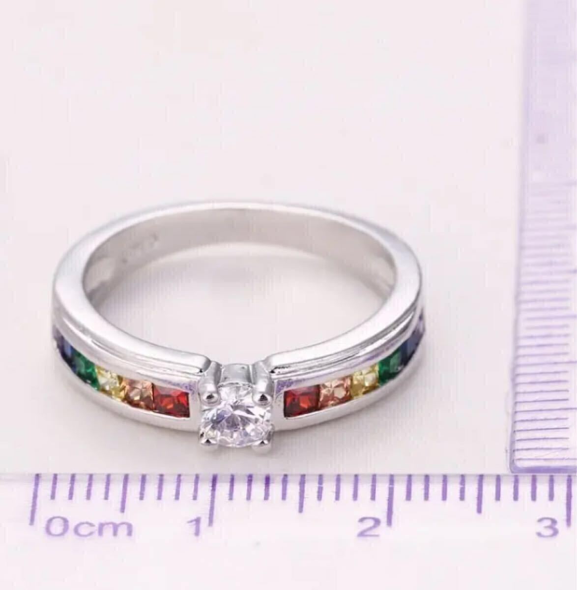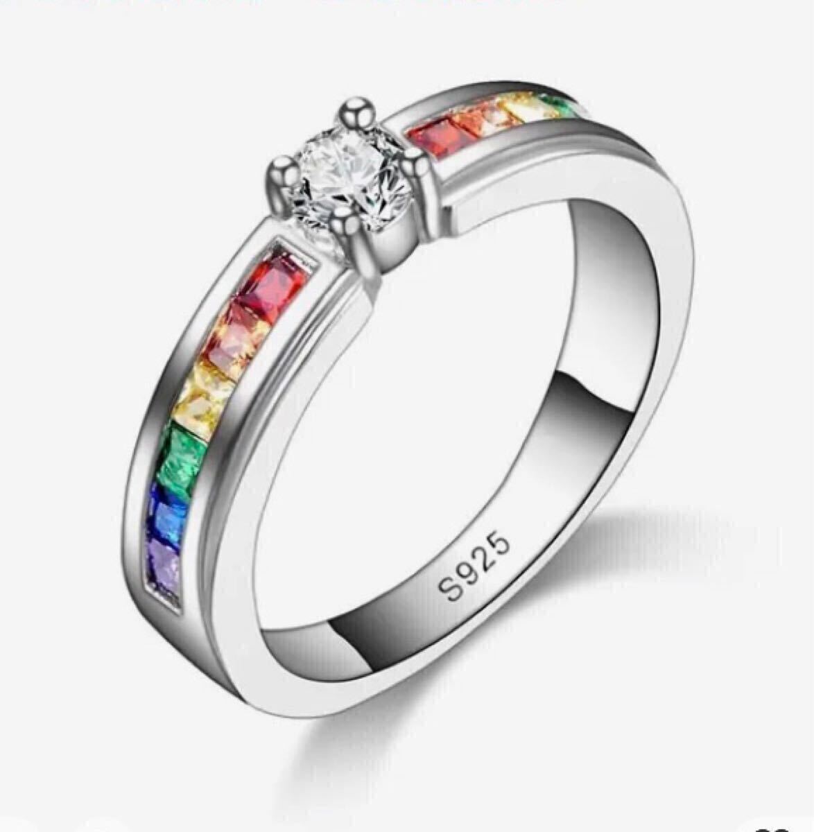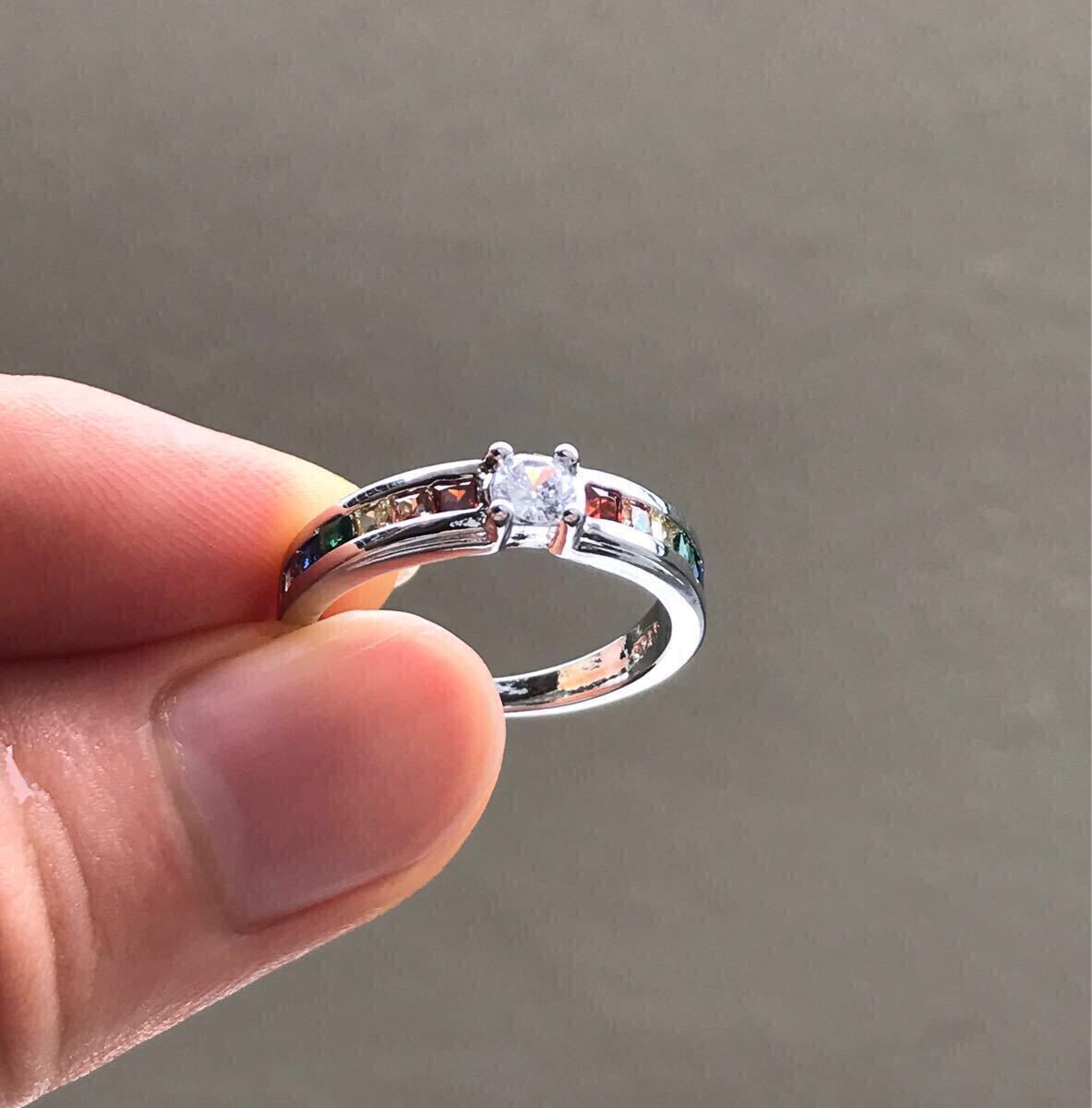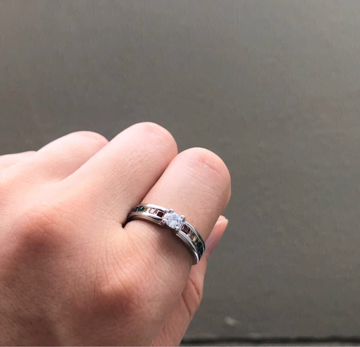中央の大粒CZダイヤモンドと両サイドを彩るレインボーカラーのCZクリスタルが華やかなリングです。お好みのファッションに合わせてお楽しみください。