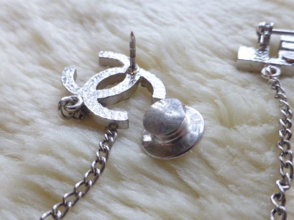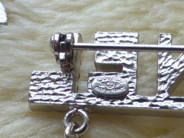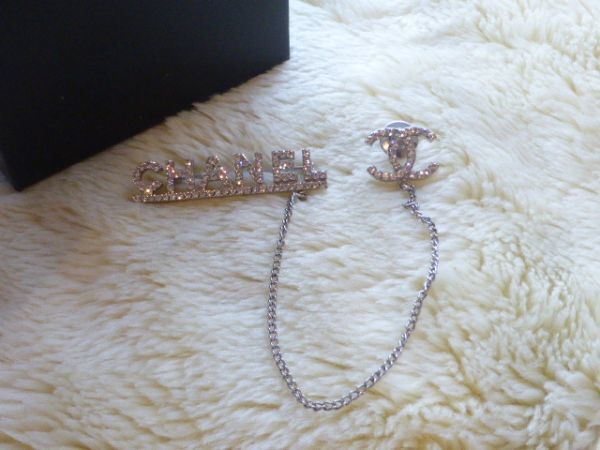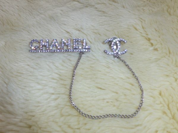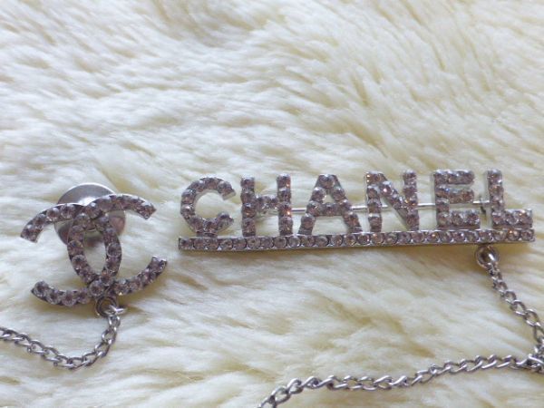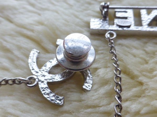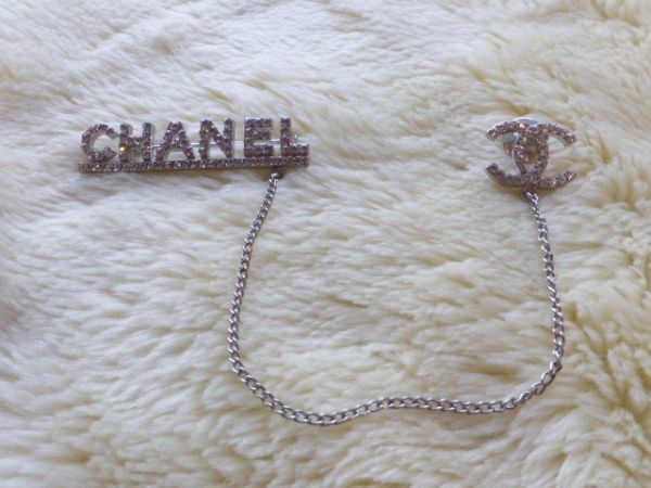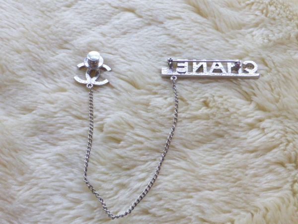 CHANELの方はピンタイプ COCOマークはピンバッチタイプで2箇所で留めていただくデザインで、2つのモチーフがチェーンでつながっているデザインです。