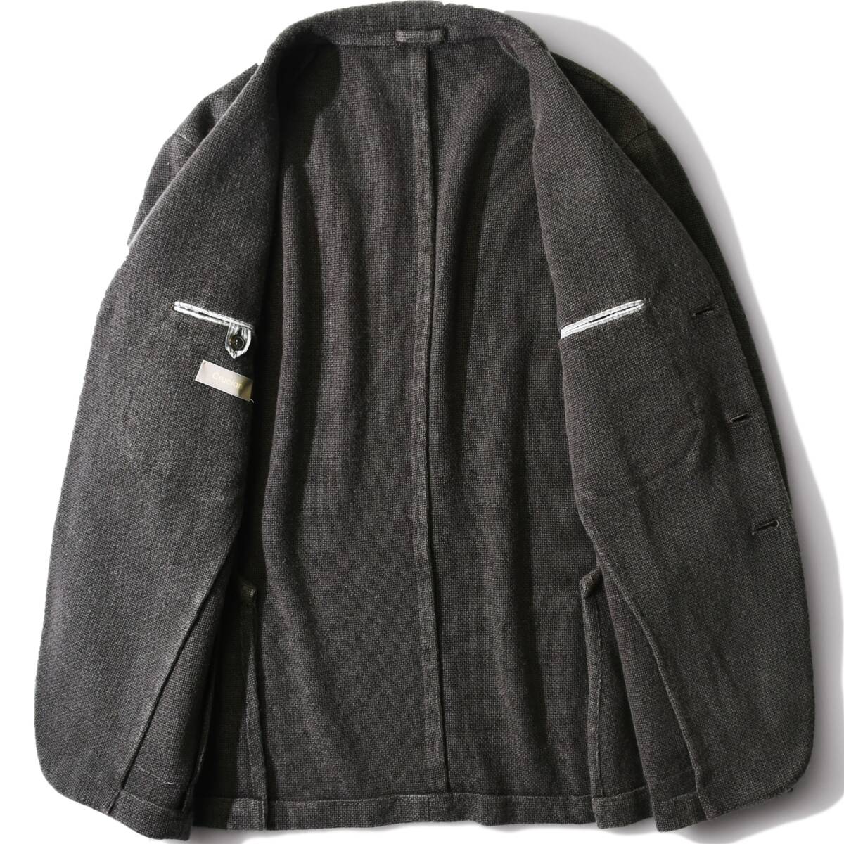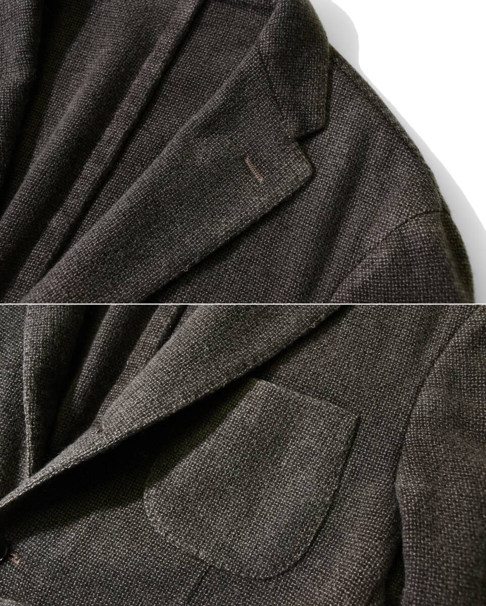 シャツジャケットのようなアンコン仕立ての一枚仕立てになっており、 肩パッドなどの副資材が省かれているので、肩まわりや胸まわりはノンストレス。副資材を省くことによって、やわらかく、 色気のあるシルエットが表現されていますが、最高峰のサルト技術(熟練した職人のアイロンワークや縫製)を駆使することで、 ジャケット本来の¨凛とした佇まい(カッチリした感じ)¨は失わず大人らしく上品に着こなして頂けます。