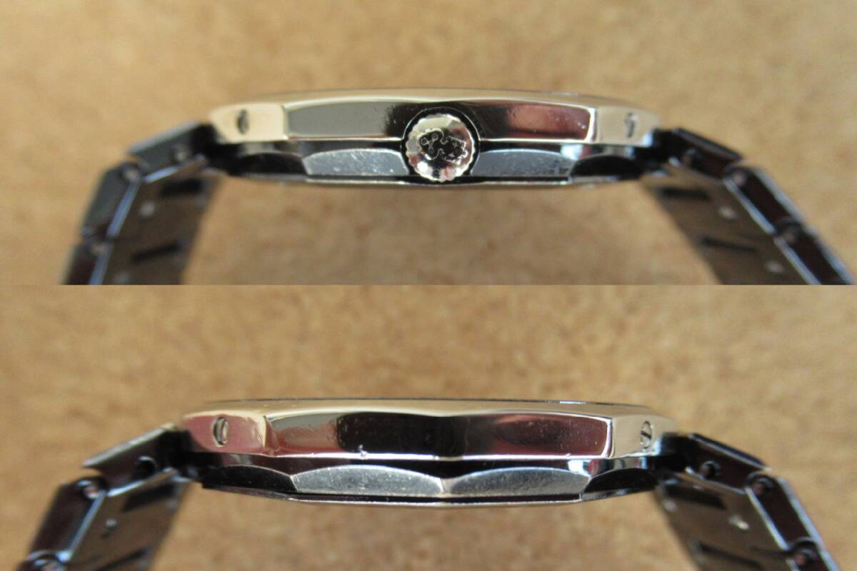 状態は、微細な使用傷程度で外装リフレッシュ済みの大変綺麗な状態です!!(神経質な方はご遠慮下さい。)  ブレスの伸びも感じられない個体をベースに、ステンレス部分に研磨仕上げを施しました。 ブレス裏のバックルが当たる部分に若干のコーティングの剥がれが有ります。 本体ブレス共に除菌洗浄済みなので、買い取った物をそのまま並べるリサイクル店に有る様な隙間に手垢汚れのこびり付いた気持ち悪い物とは異なります!!