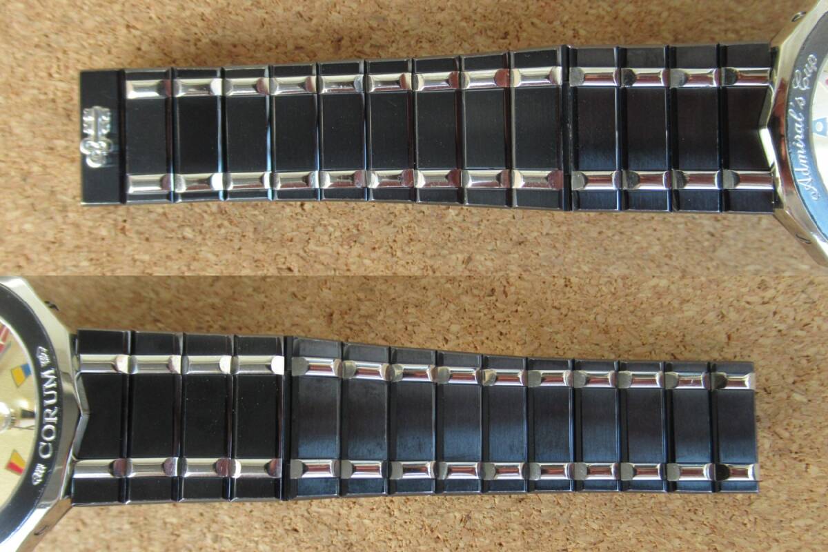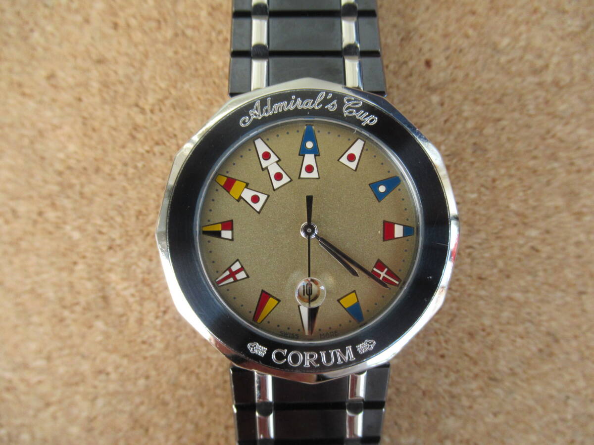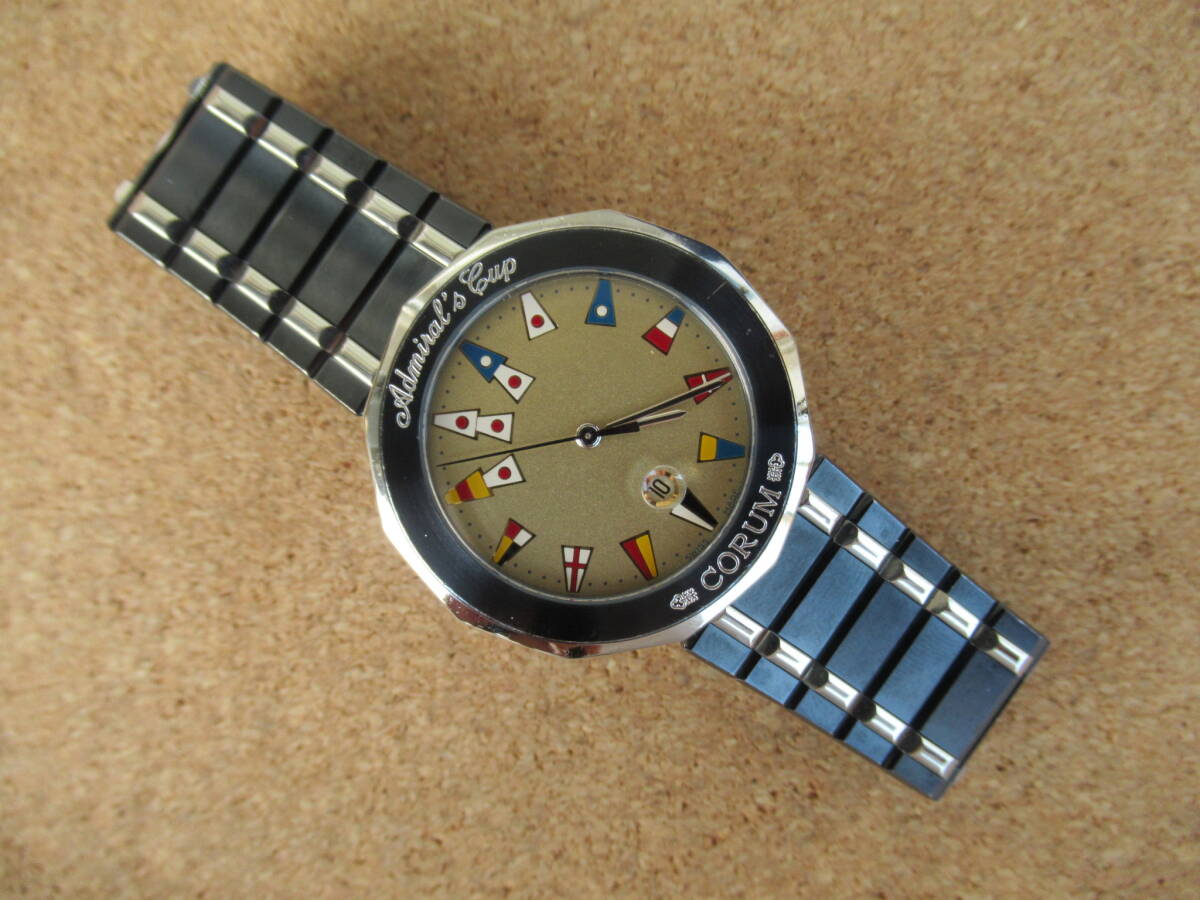 CORUMのアドミラルズカップ《99.810.30 V550》メンズモデルの希少なガンブルー/ステンレスコンビです!! バブル景気の時代に大ブレイクしたお馴染みの時計ですね。 長期間に渡り販売されたので何度か外装の仕様変更が行われており、出品は希少なブレスの宝飾サイズが大きくなった最終モデルです!! 人気モデルなのでお見逃しなく!! ケース幅は約34ミリ、腕周りは測定具計測で約17.5センチでコマを外す事で短く出来ます。 出品時(25/11/11)は普通に稼働してます。