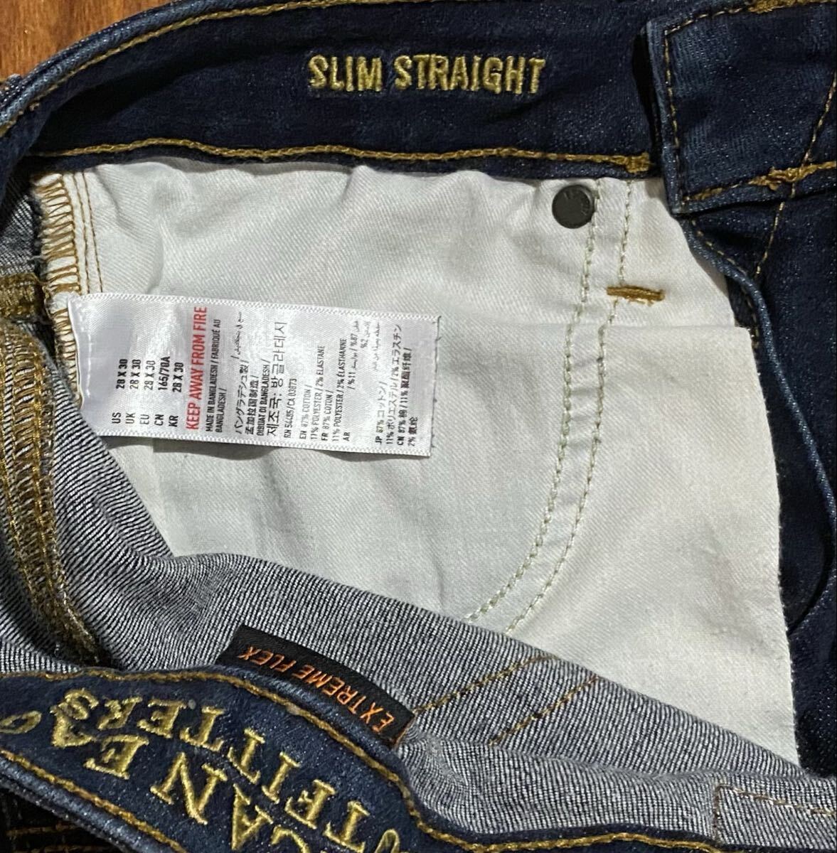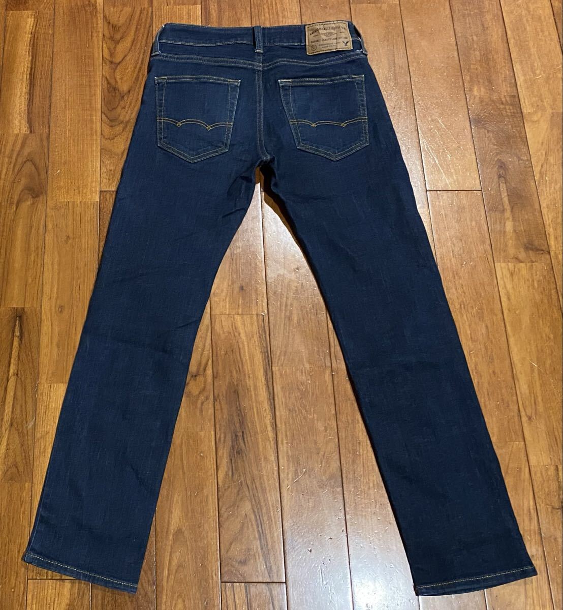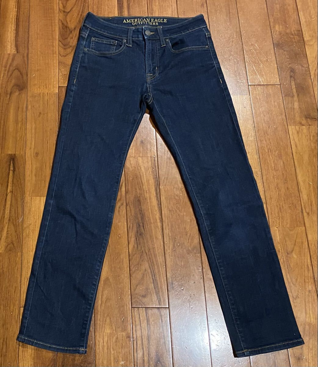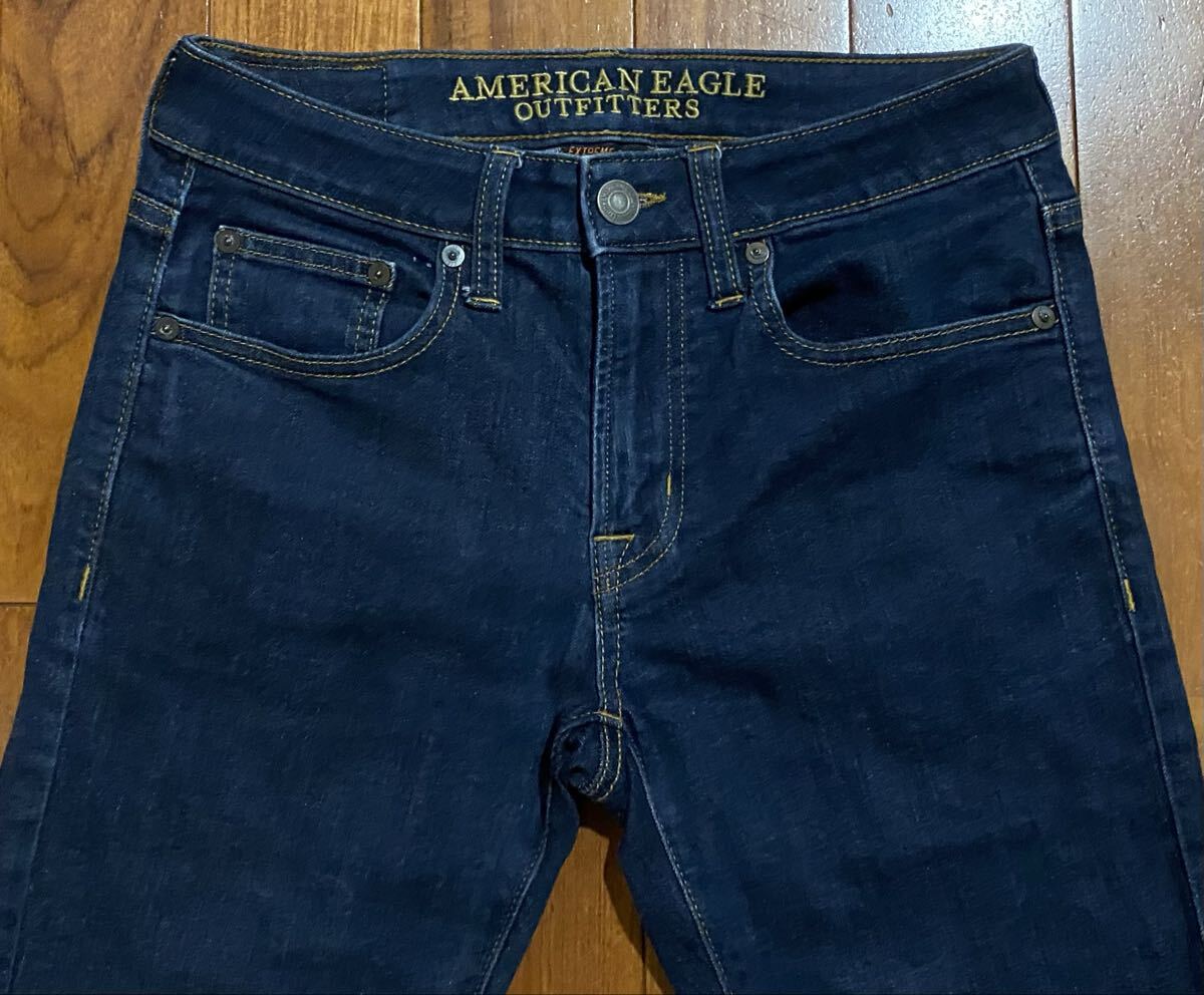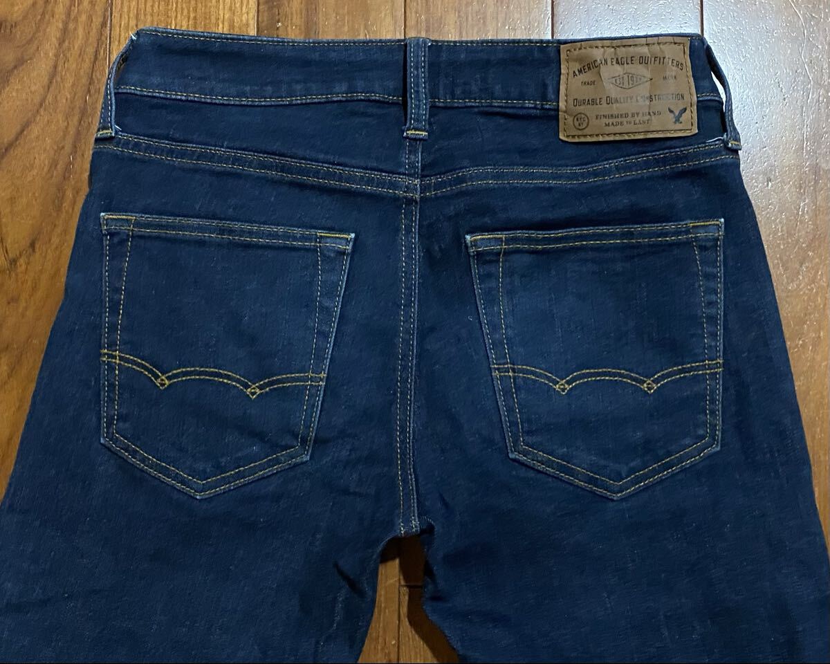 アメリカンイーグルのストレッチデニム(ジーンズ)、EXTREME FLEX SLIM STRAIGHTです。色はインディゴブルーです。USEDですが状態は良いです(10段階中8程度)。生地はストレッチ入りでコットン87%、ポリエステル11%、エラスチン2%です。紙パッチ、ジッパーフライ、裾はチェーンステッチです。正規品です((株)イーグルリテイリング、バングラデシュ製)。サイズはW28×L30でウエストは重ねずに平置きで約72cm、ヒップ約94cm、股上約23cm、股下約71cm、股下15cmのふともも部分約44cm、裾まわり約33cm、重量約470gです。発送はゆうパケットポストになります。