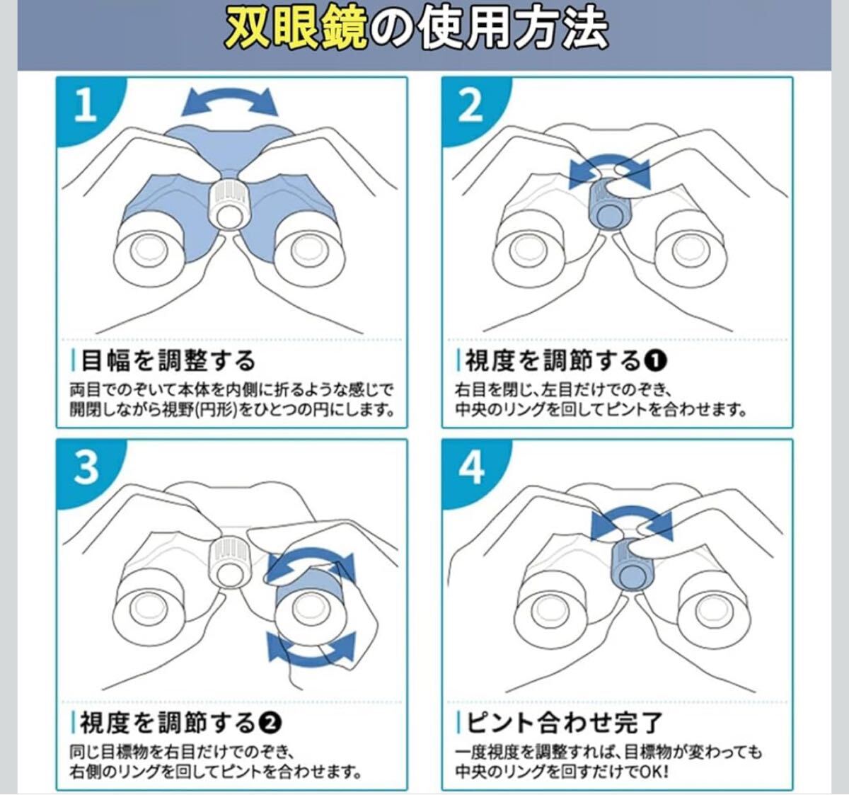 生活防水&使用方法:この製品はの生活防水レベルに達することができます。雪や雨が本体に降っても、乾いたきれいなポリエステルまたは両面フランネルで拭き取るだけで、その後の使用に影響しません。32mmから75mmまでの目幅は調整可能で。たった3つのステップで臨場感あふれる画像を楽しめます。①目幅を調整 → ②ピントリングを調整 → ③視度調整リングを回す。自分に合った目幅に調整できます。