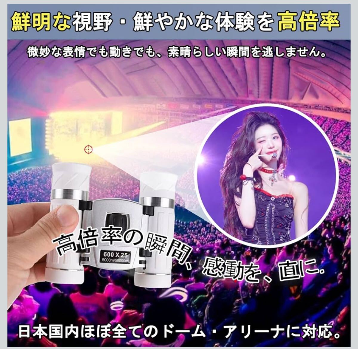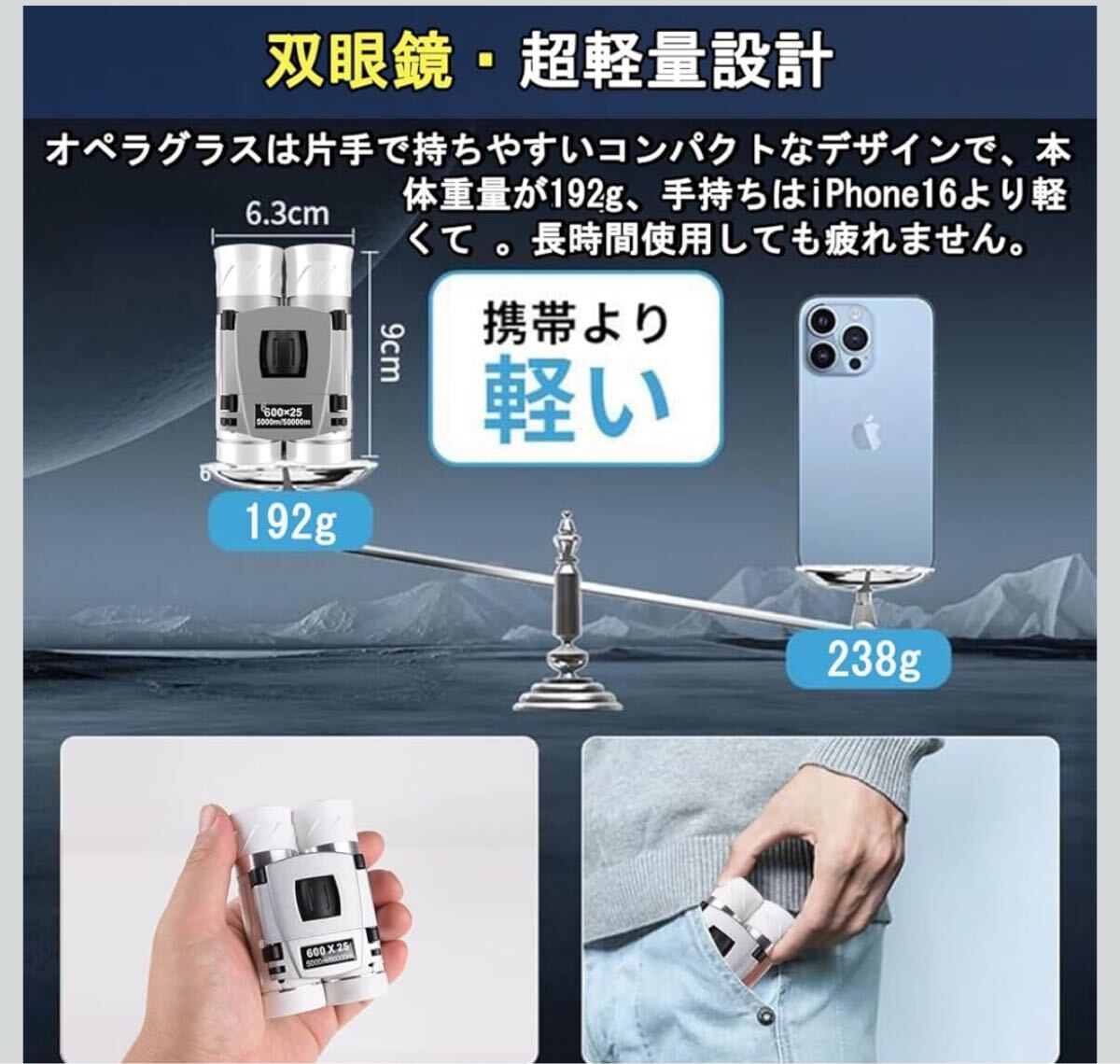 双眼鏡 ライブ用 ドーム&超軽量&コンパクト:オペラグラスは片手で持ちやすいコンパクトなデザインで、本体重量が192g、手持ちはiPhone16より軽くて 。長時間使用しても疲れません。コンパクトでカバンや首掛けて持ち歩いても邪魔になりません。折りたたむとさらにコンパクトになり、バッグに楽々収納できます。お子様や女性に最適。コンサートやスポーツ観戦、ライブ、オペラ、観劇、野鳥観察などに最適です。